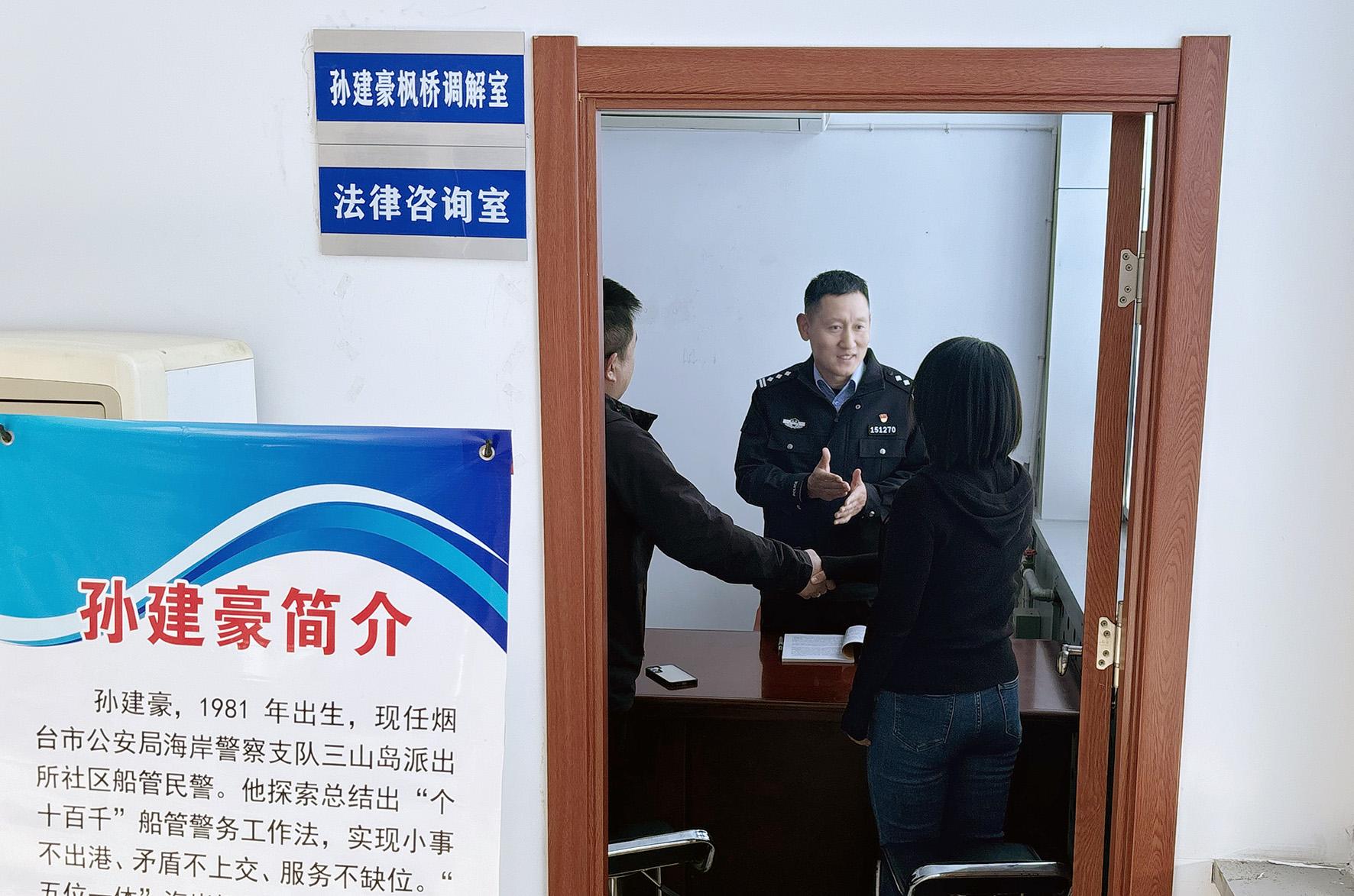 11月5日,山東省煙臺市海岸警察支隊三山島派出所民警孫建豪正在調解室內(nèi)調解一起糾紛。為推動矛盾糾紛排查化解工作,萊州市三山島街道辦事處成立以海岸民警孫建豪命名的楓橋調解室。