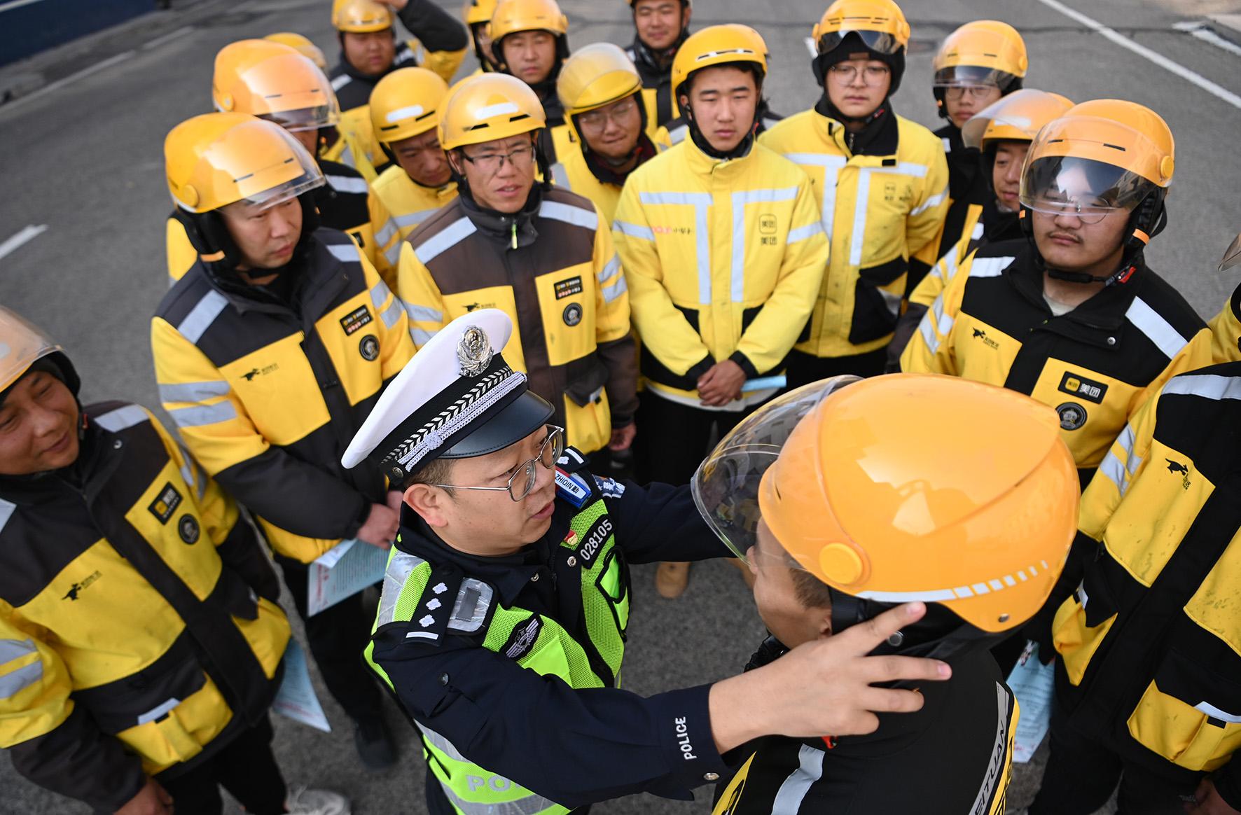 11月8日,山西省大同市廣靈縣公安局交通警察大隊民警對從事外賣送餐的駕駛?cè)诉M行交通安全知識培訓(xùn)。