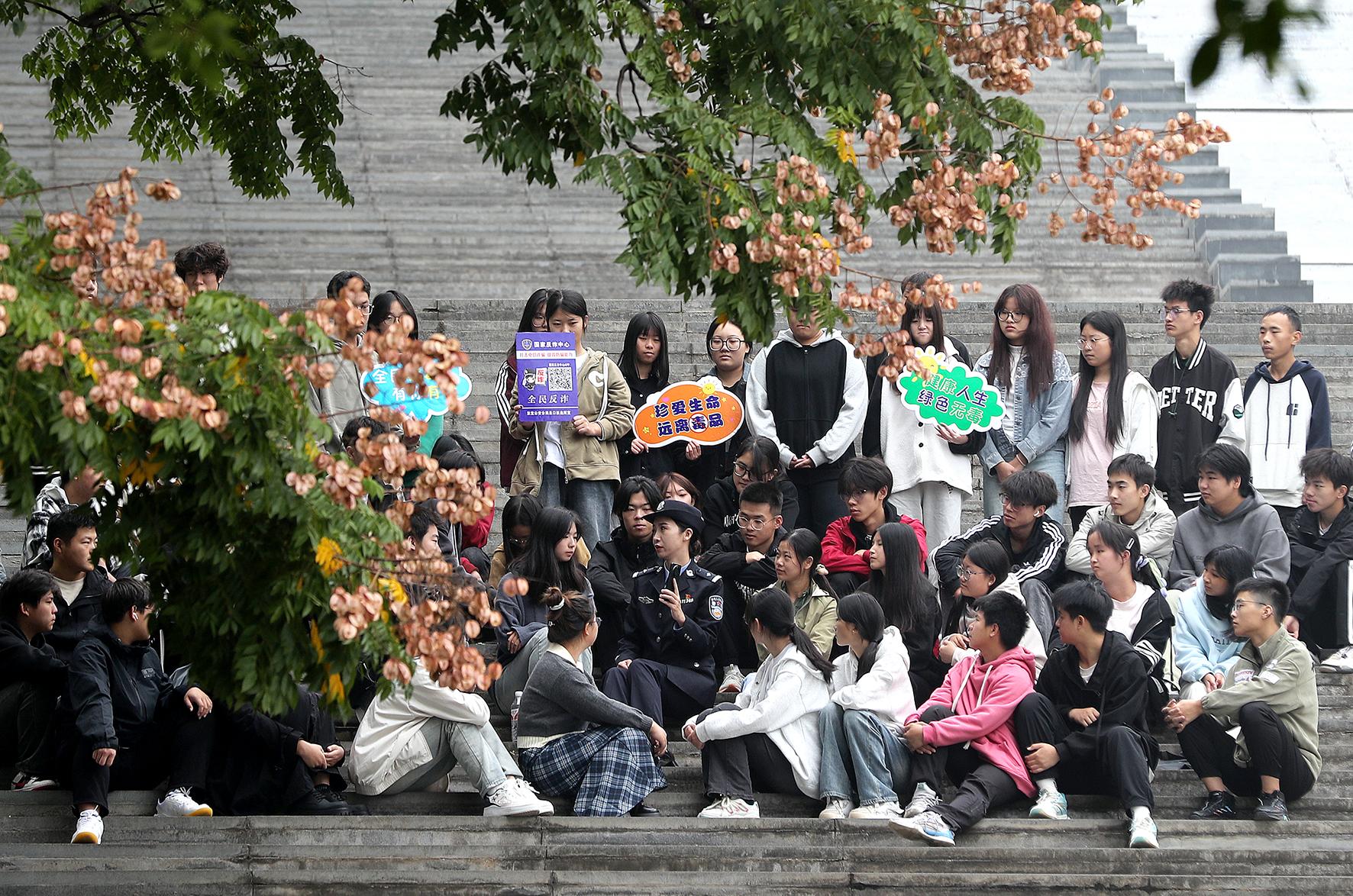 11月14日,湖北省荊門市公安局東寶分局泉口派出所民警在荊楚理工學(xué)院,向大學(xué)生開展“禁毒+反詐”主題宣傳。