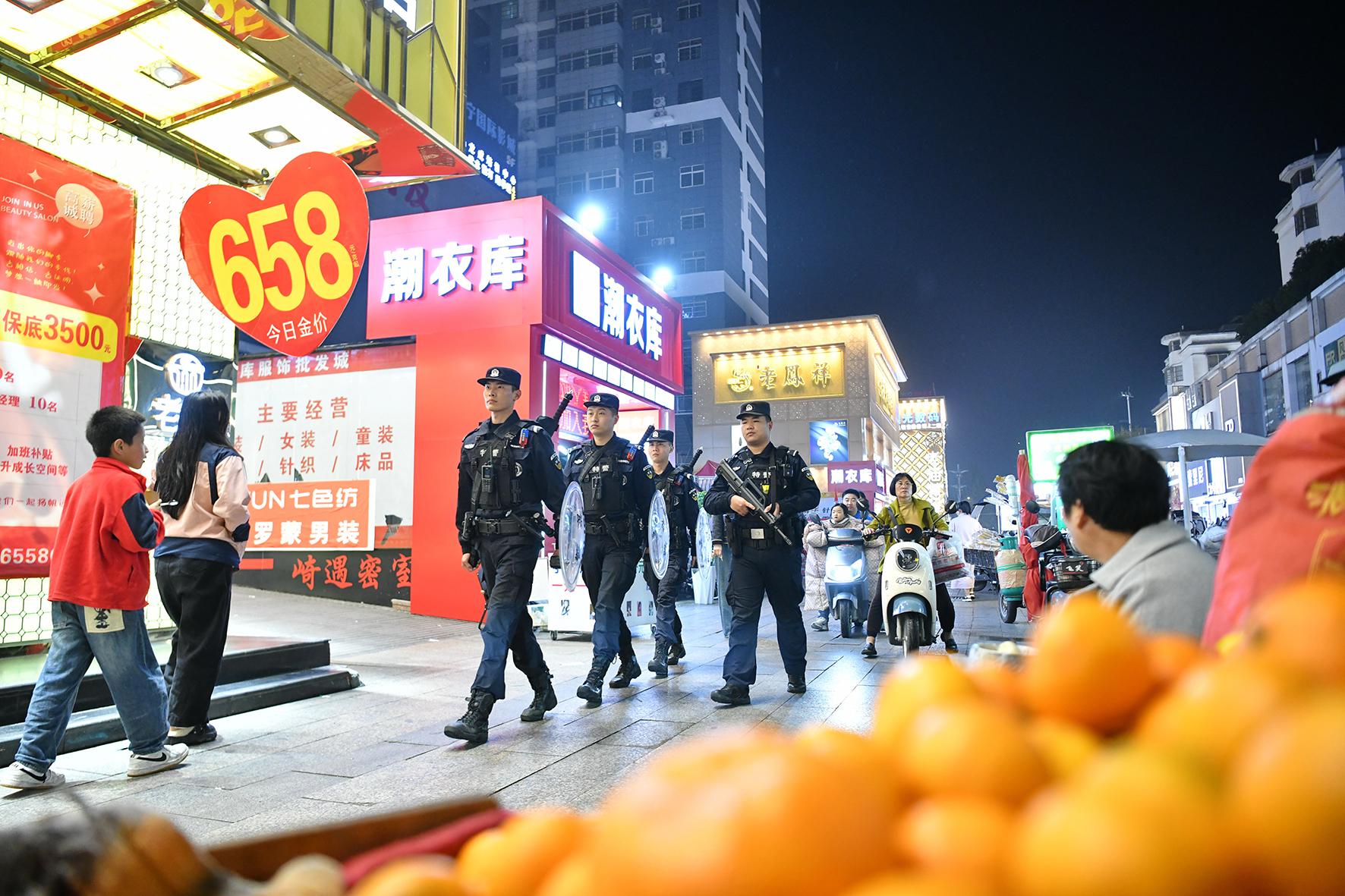 11月15日晚,安徽省阜南縣公安巡警在城區(qū)一商業(yè)步行街巡邏。阜南縣公安局巡防大隊(duì)加大夜間巡邏力度,采取車巡、步巡和視頻巡等相結(jié)合方式,對(duì)轄區(qū)主要街道、商業(yè)區(qū)和公園等人員密集場(chǎng)所和重點(diǎn)區(qū)域進(jìn)行不間斷巡邏,排查消除安全隱患,增強(qiáng)人民群眾的安全感、幸福感。