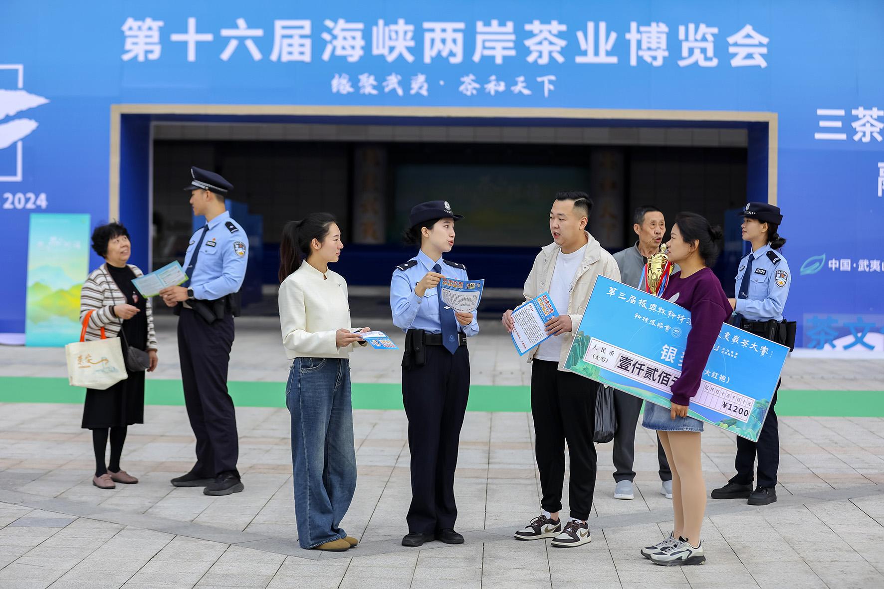 11月19日,福建省武夷山市公安局新豐派出所民警正在給參加茶業(yè)博覽會的客商介紹反詐知識。