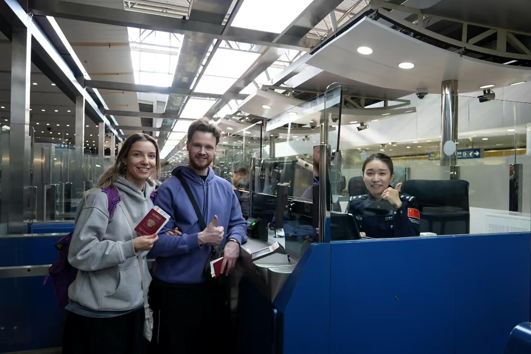 12月17日10時許,一對俄羅斯情侶成功申請240小時臨時入境許可,成為北京首都國際機場T2航站樓首批享受過境免簽新政策的外國籍旅客。國家移民管理局12月17日發(fā)布公告,將過境免簽外國人在境內(nèi)停留時間由原72小時和144小時均延長為240小時。為確保政策措施精準高效實施,北京邊檢總站加強勤務(wù)組織調(diào)度和旅客流量監(jiān)測,精準布設(shè)引導標志,積極組建多語種服務(wù)小組,選派精通外語的民警做好政策解讀,確保申請240小時臨時入境許可的外籍旅客準確獲取信息、有序排隊申請,提高臨時入境許可簽發(fā)效率。