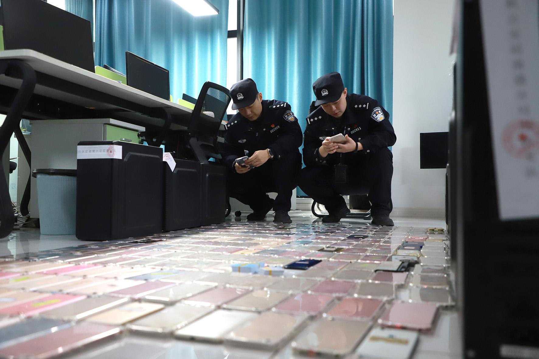 圖為民警對(duì)作案所使用的手機(jī)、電腦等工具進(jìn)行扣押、清點(diǎn)。
