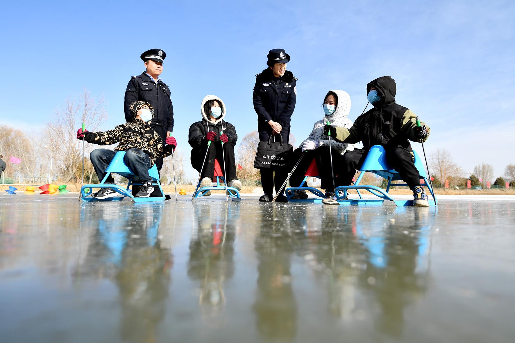 1月13日,甘肅省臨澤縣公安局城關(guān)派出所民警輔警走進(jìn)轄區(qū)冰上游樂園,宣傳冰面活動(dòng)安全知識(shí)。