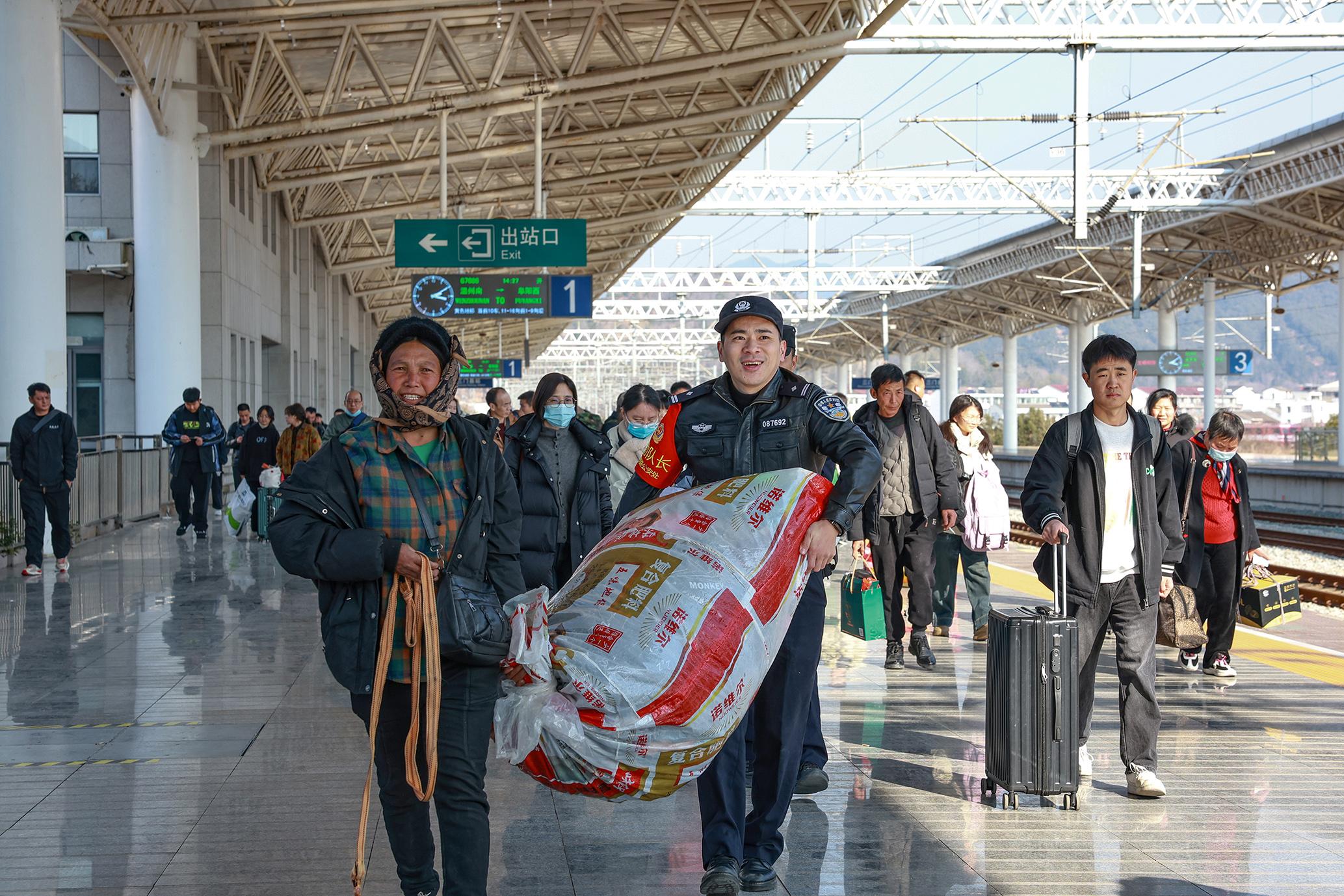 圖為1月18日,臺州火車站派出所民警幫助旅客搬運行李。