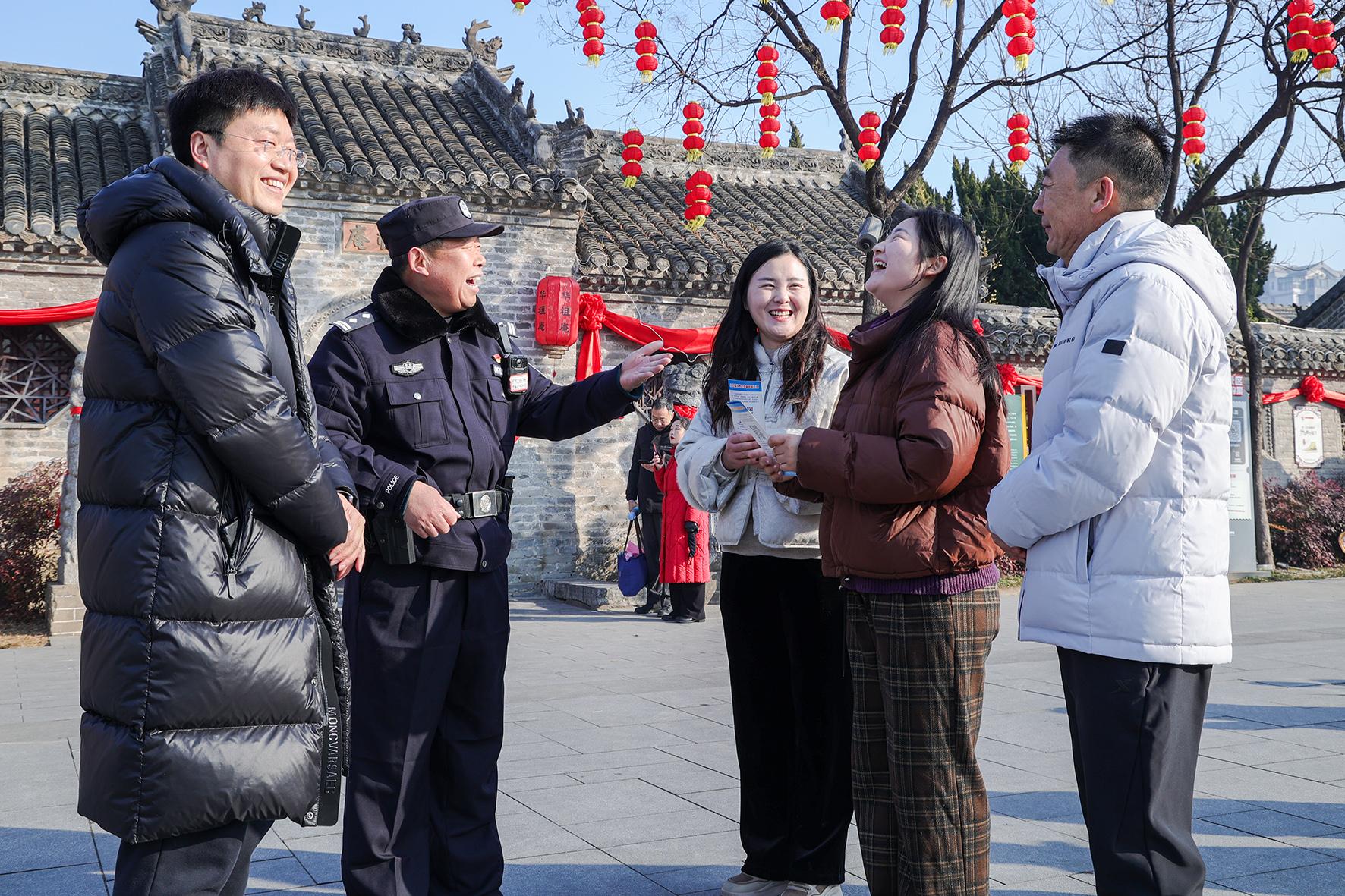1月29日,安徽省亳州市譙城分局民輔警在華祖庵景區(qū)巡邏執(zhí)勤,開展反詐宣傳,守護(hù)游客安全。