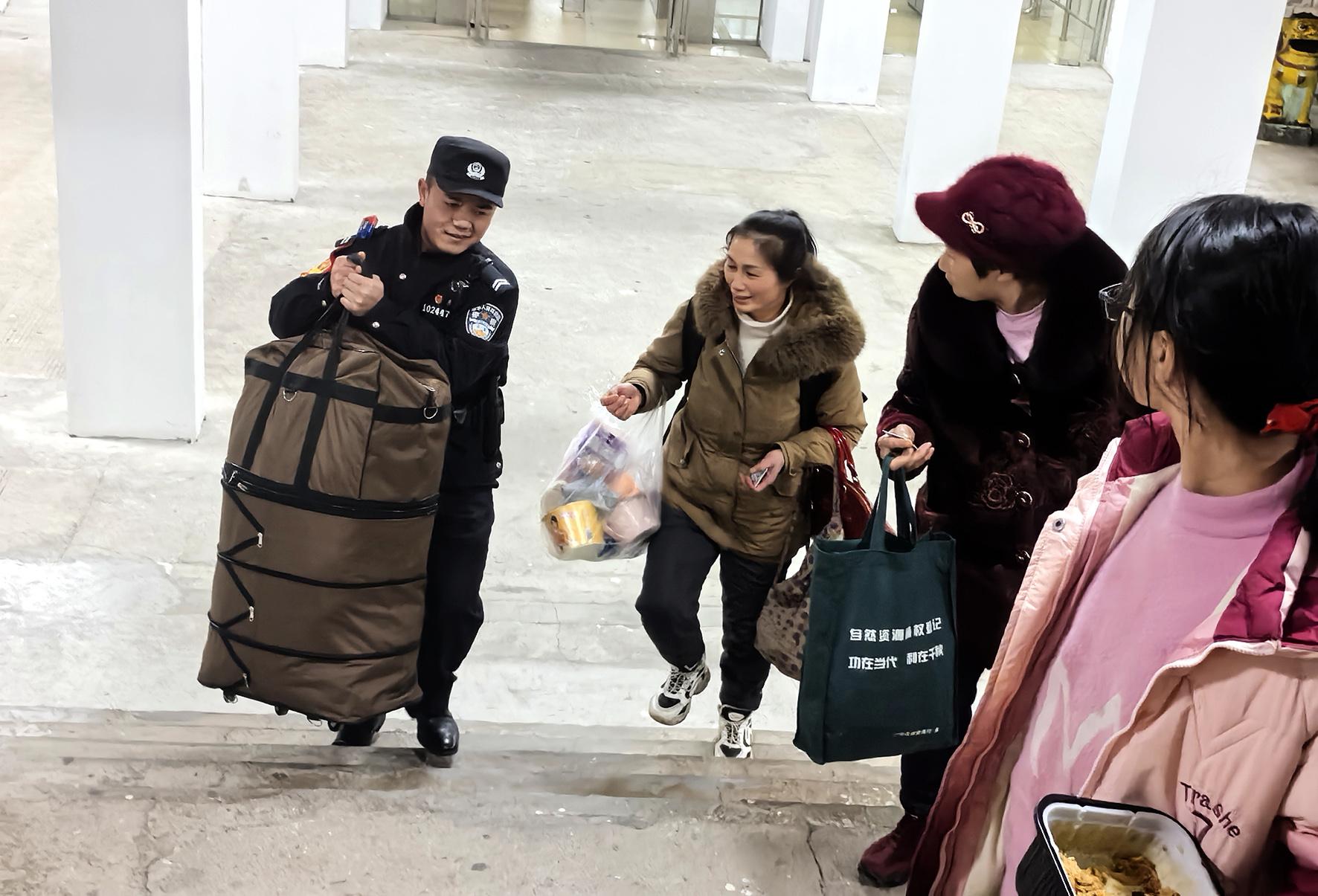 2月4日,成都鐵路公安局貴陽公安處銅仁南車站派出所民警幫助旅客搬運(yùn)行李。