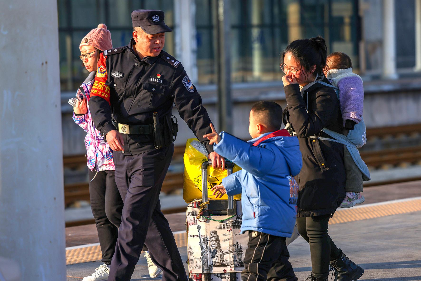 2月2日,廣西柳州鐵路公安處融水站派出所執(zhí)勤民警堅(jiān)守崗位,護(hù)送旅客平安出行。