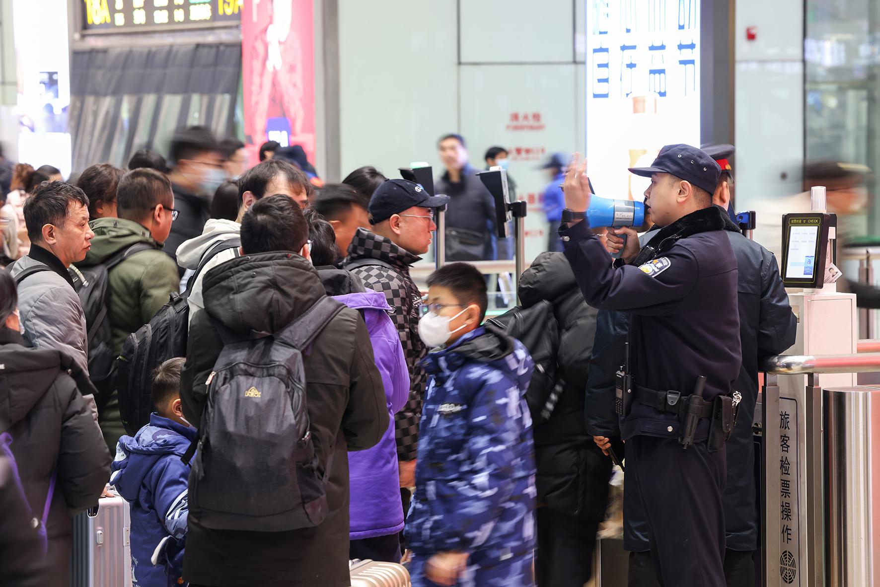 2月3日,農(nóng)歷正月初六。安徽省舒城縣高鐵東站迎來返程高峰。舒城縣公安局千人橋派出所高鐵東站警務(wù)站民警輔警在入站口平臺疏導(dǎo)交通、服務(wù)群眾,確保返程旅客平安出行。