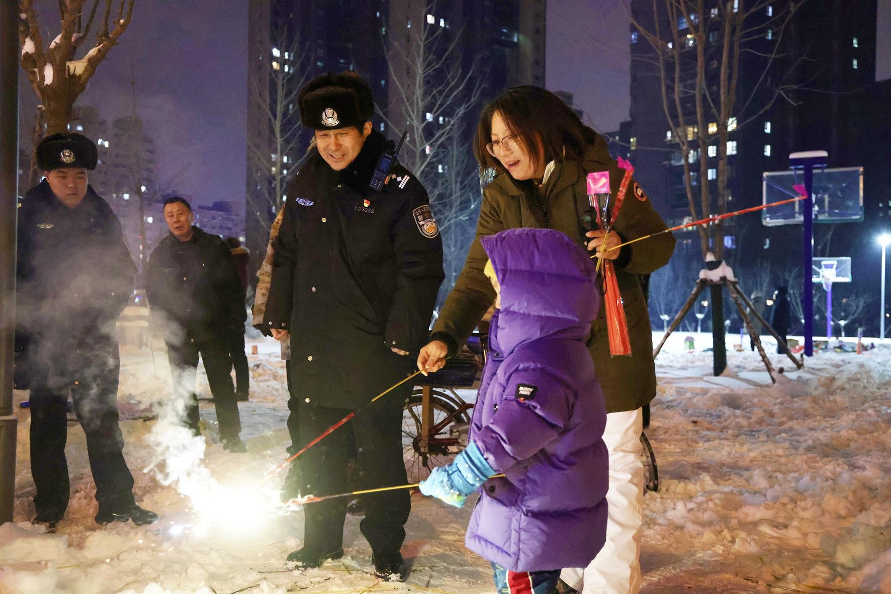 1月29日,遼寧省沈陽市渾南分局五三派出所民警對燃放煙花的群眾進(jìn)行勸導(dǎo)。