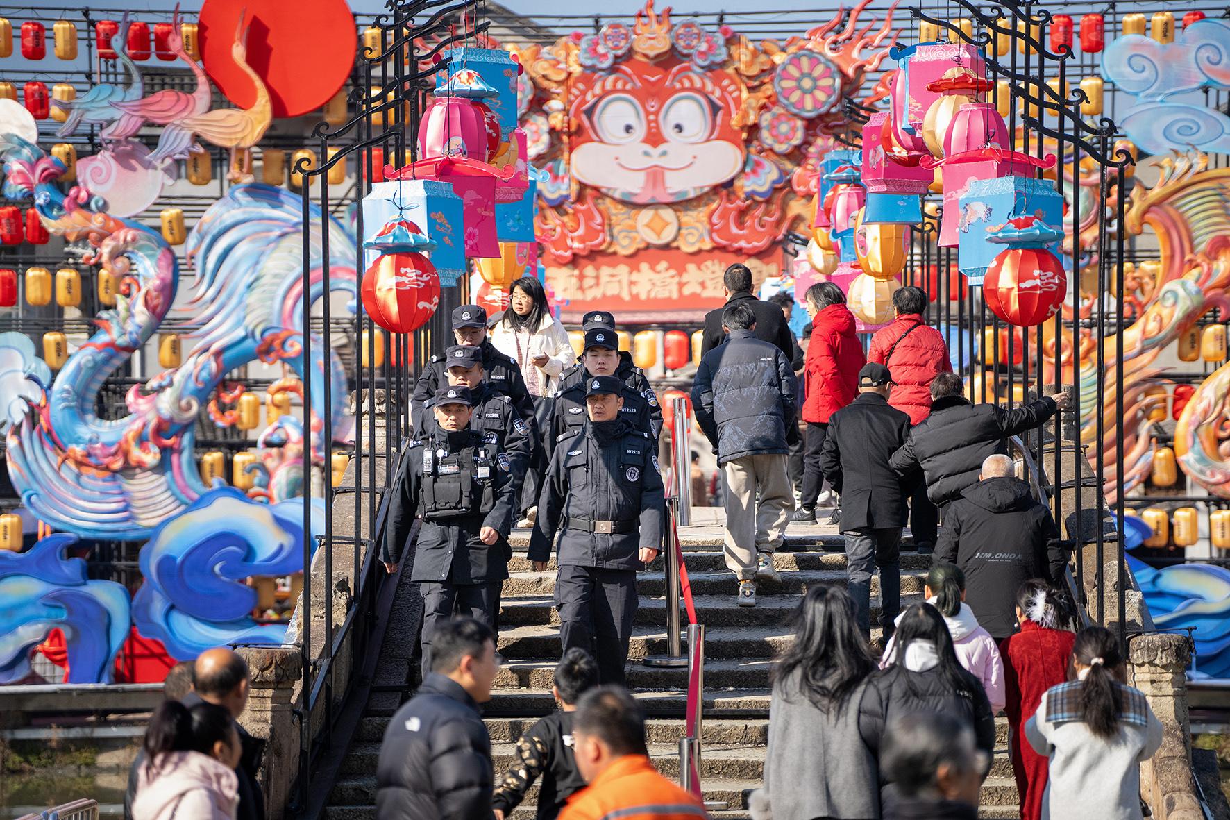 1月29日,大年初一。浙江省臺州市公安局黃巖分局巡特警大隊(duì)民警在景區(qū)巡邏。