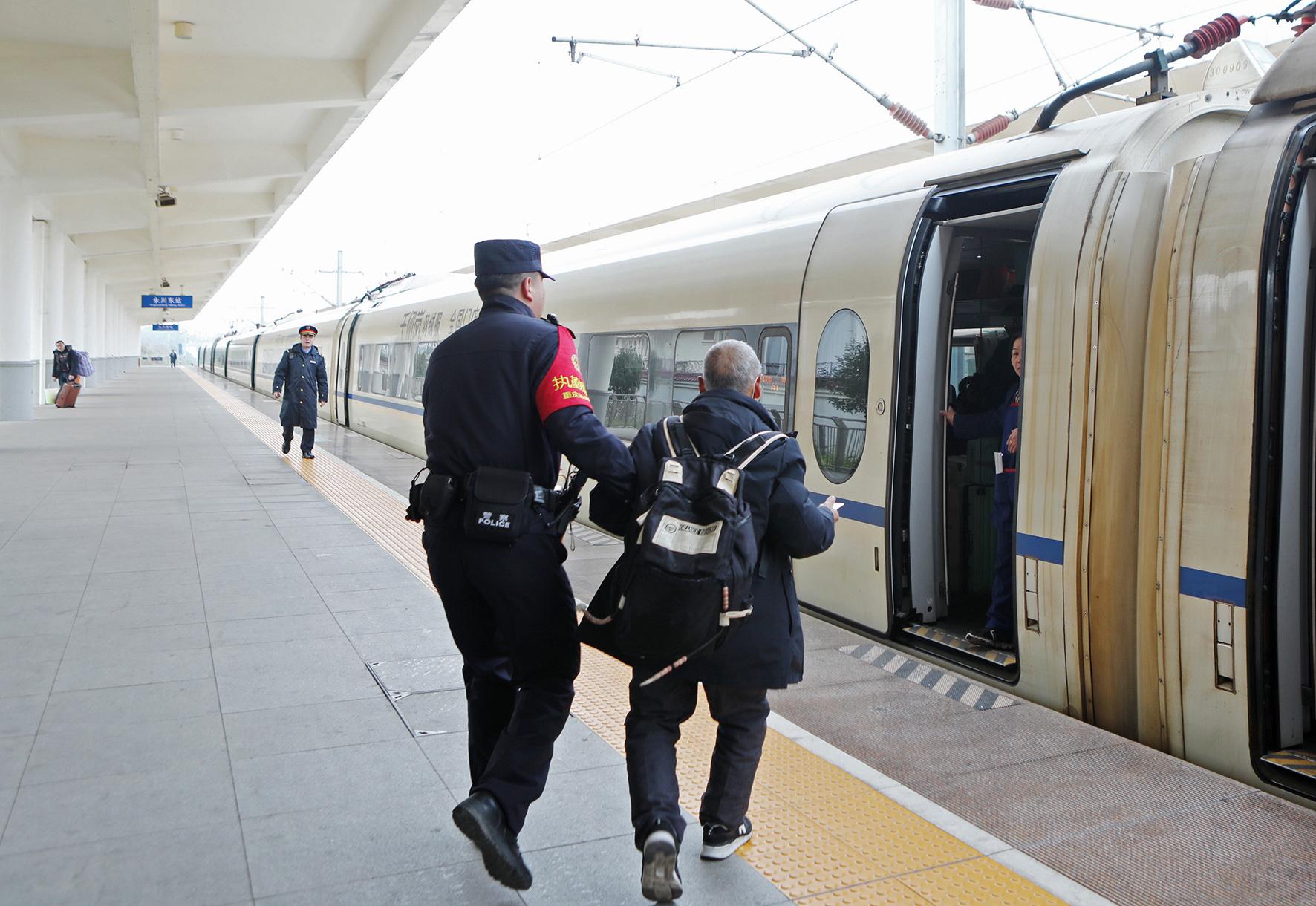 2月4日,重慶鐵路公安處永川東車站派出所值班民警幫助一位老人乘車。