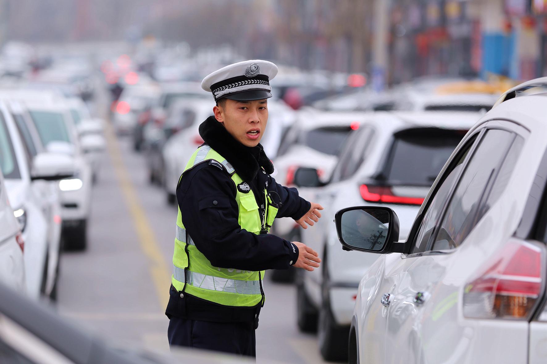 2月1日,陜西省渭南市潼關(guān)縣公安局交警大隊(duì)民輔警在景區(qū)主要路段指揮疏導(dǎo)交通。