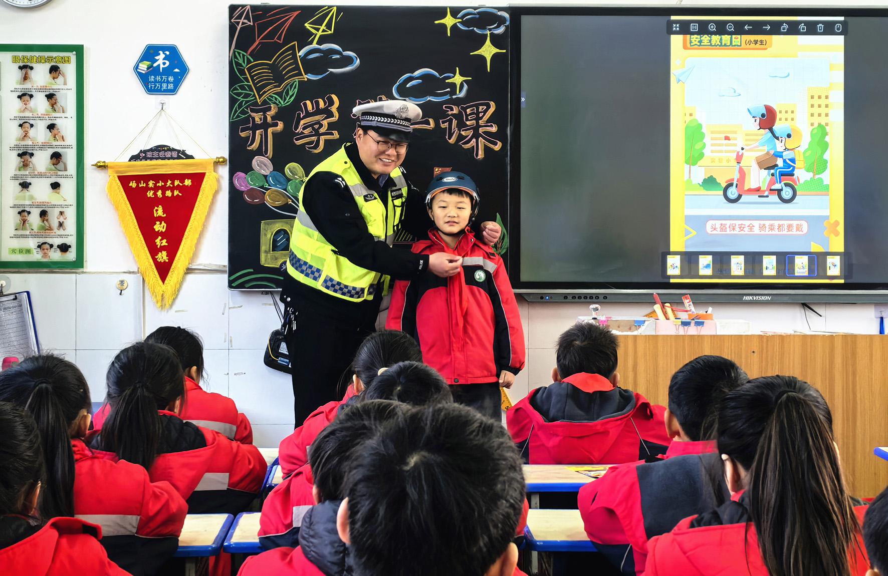 2月14日,安徽省合肥市公安局交警支隊廬陽大隊民警走進育新小學(xué)開展“新春開學(xué)第一課”安全宣教活動。