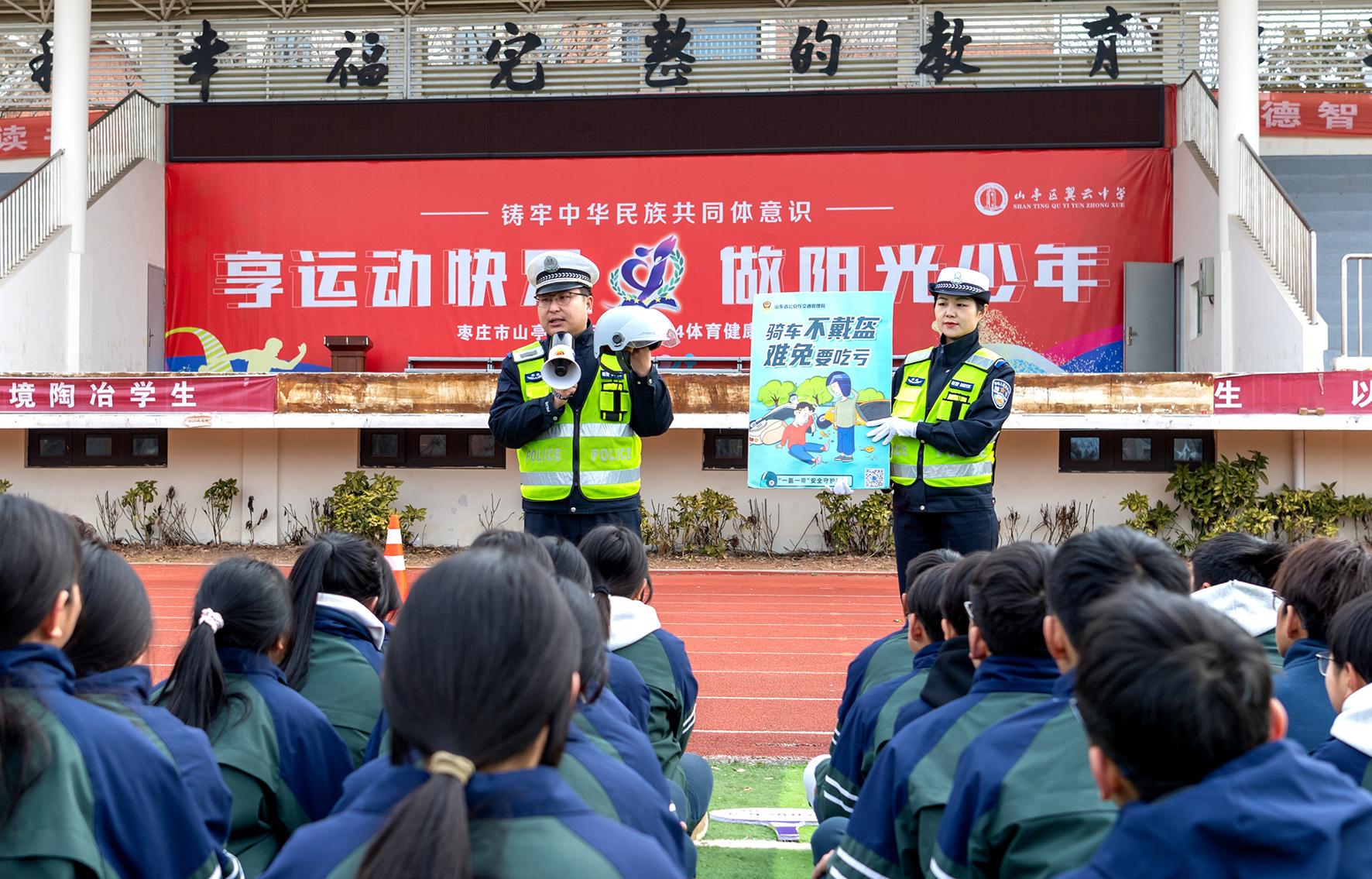 2月14日,山東省棗莊市公安局山亭分局交警大隊組織民輔警走進轄區(qū)翼云中學(xué),開展春季“開學(xué)第一課”交通安全宣傳活動。