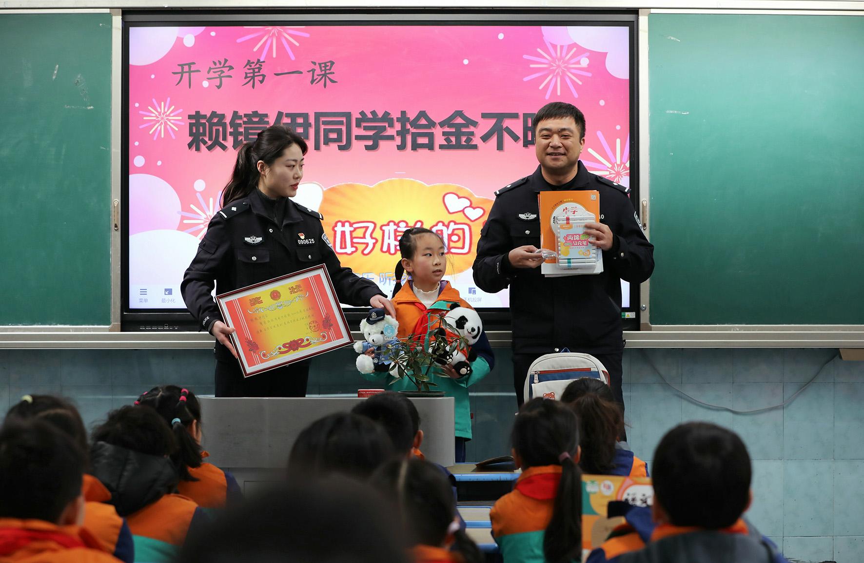 2月14日,安徽省寧國市公安局西津派出所借助開學(xué)“第一課”開展“送獎進課堂”思政教育。民警在表揚拾金不昧學(xué)生的同時,教育引導(dǎo)同學(xué)們要傳承弘揚中華民族傳統(tǒng)美德,爭做新時代好少年。