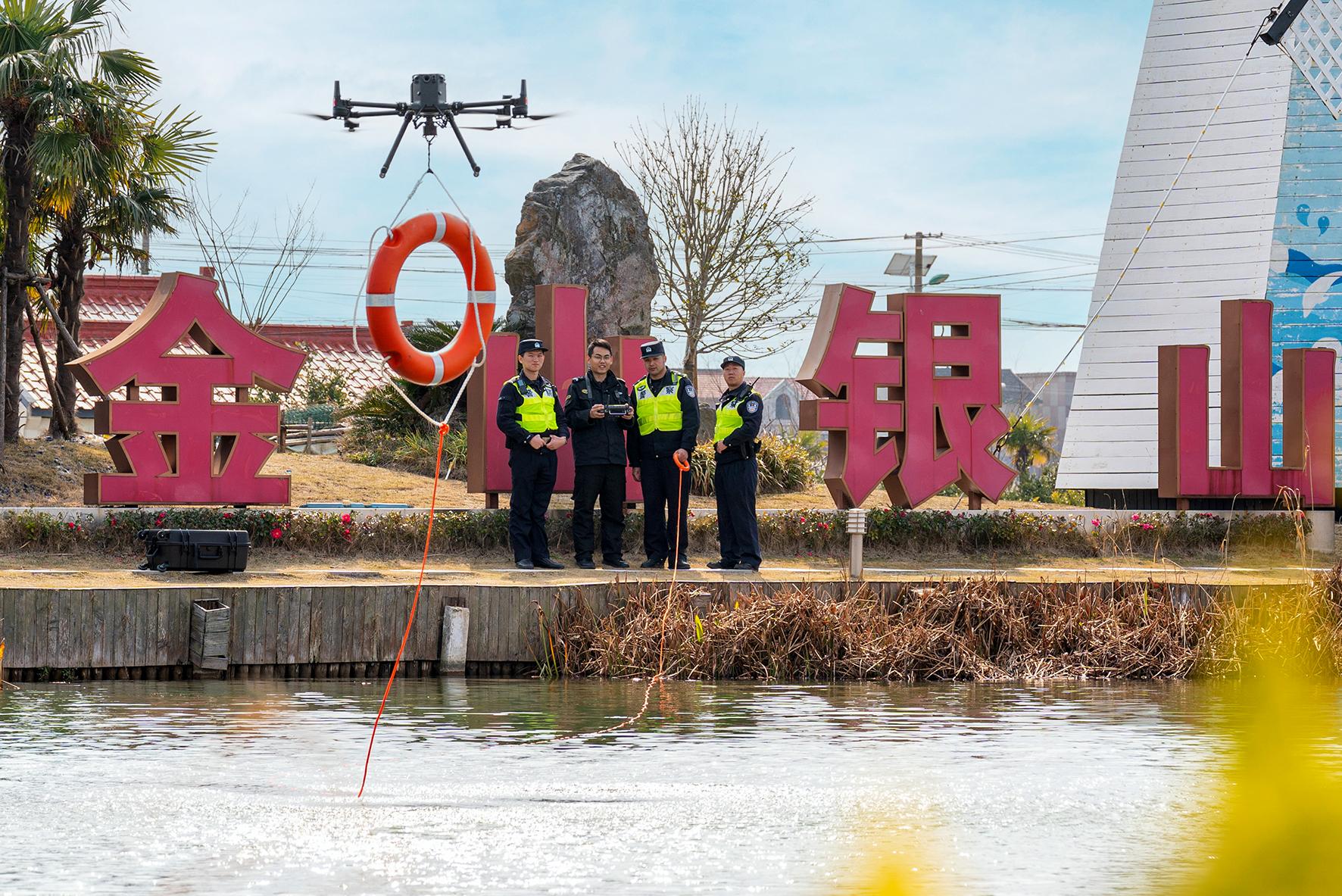 圖為2月21日,橫沙派出所民輔警利用無人機開展溺水救援訓練。