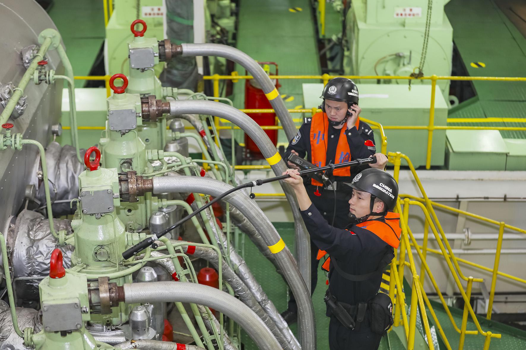 圖為3月1日,移民管理警察在貨輪機(jī)艙內(nèi)運(yùn)用紅外伸縮檢測(cè)儀進(jìn)行查驗(yàn)。