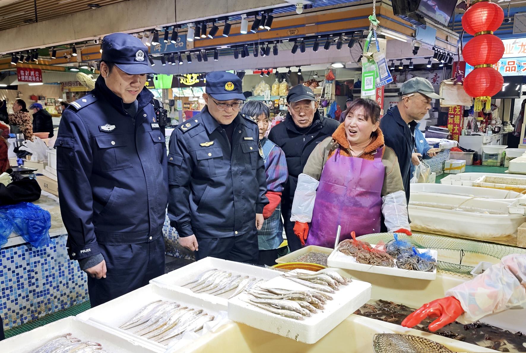 圖為聯(lián)合執(zhí)法人員檢查市場銷售刀魚情況。
