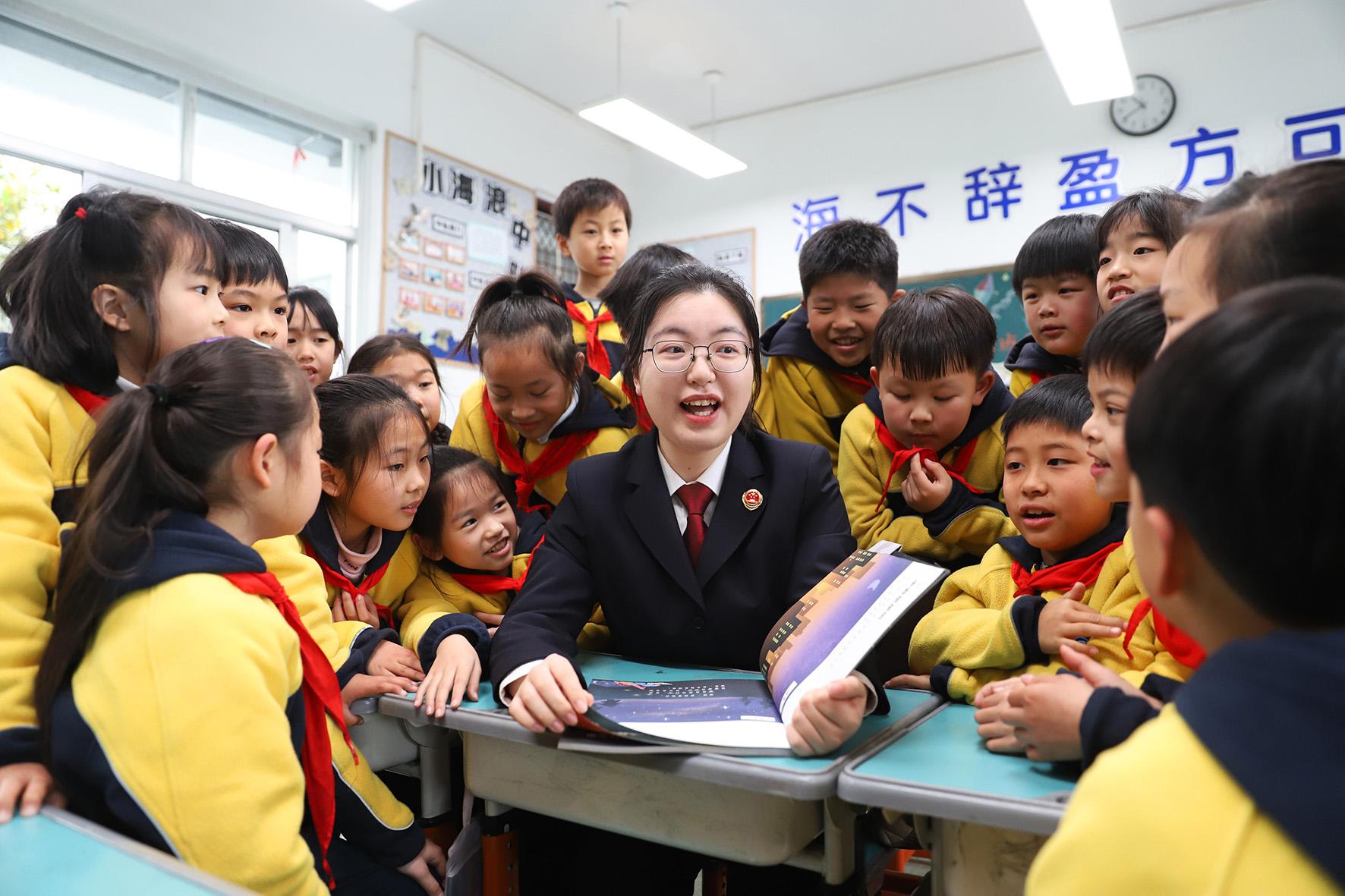 3月19日,浙江省臺州市路橋區(qū)橫街鎮(zhèn)中心小學的小學生圍著路橋區(qū)人民檢察院檢察官互動提問學知識。近年來,路橋區(qū)人民檢察院不斷加強與中小學校的互動和對學生的法治教育,從源頭守護未成年人的健康成長。