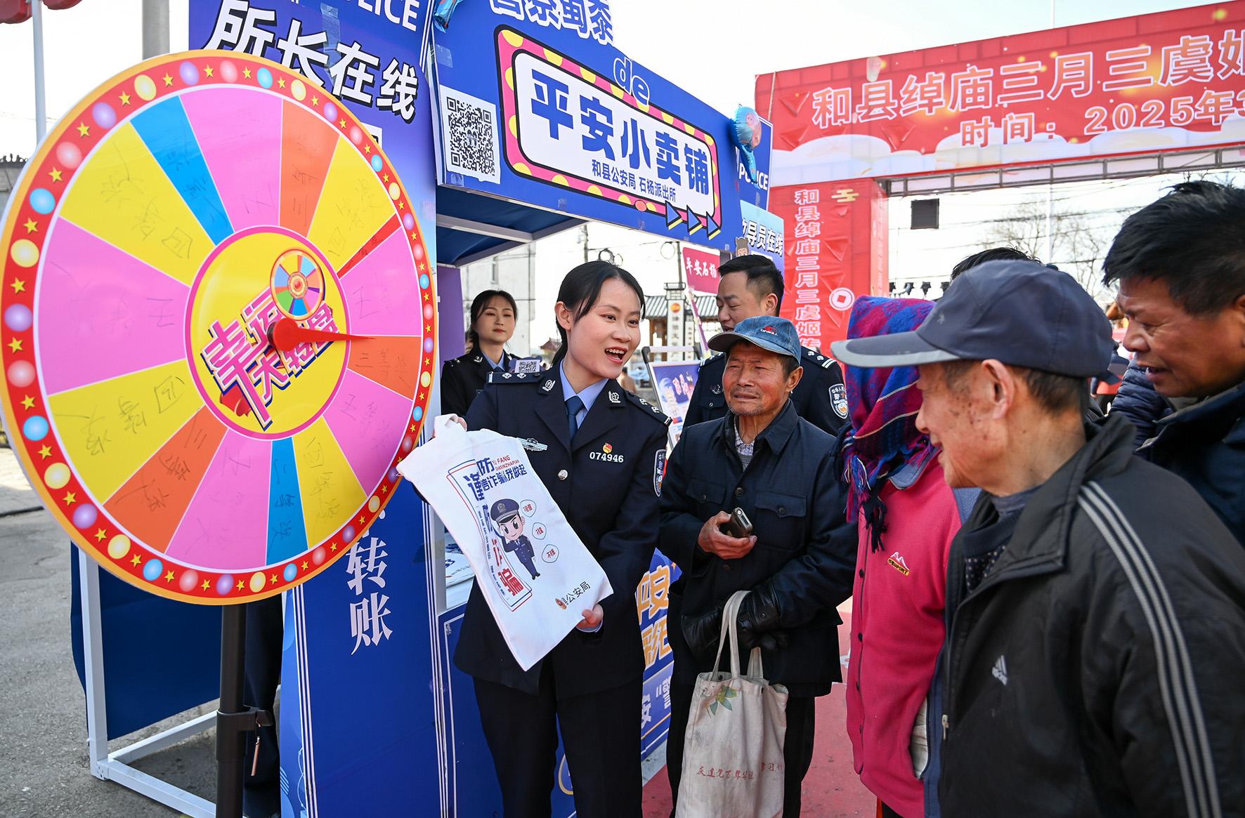 3月31日,安徽省馬鞍山市和縣公安局石楊派出所民警輔警在“廟會(huì)”現(xiàn)場向群眾開展普法宣傳。