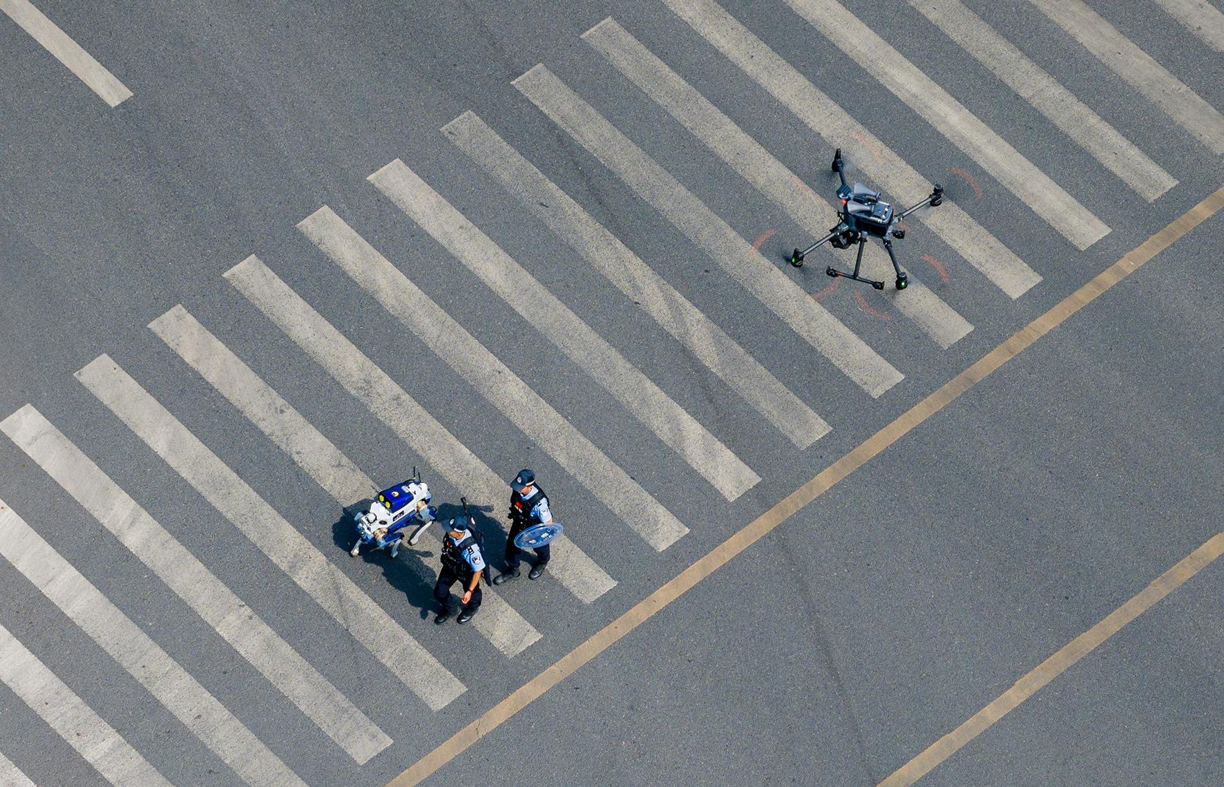 5月7日,四川省綿陽市公安局科新區(qū)分局民警帶領(lǐng)智能巡檢機(jī)器狗在綿陽市科技城新區(qū)九洲大道開展巡邏。