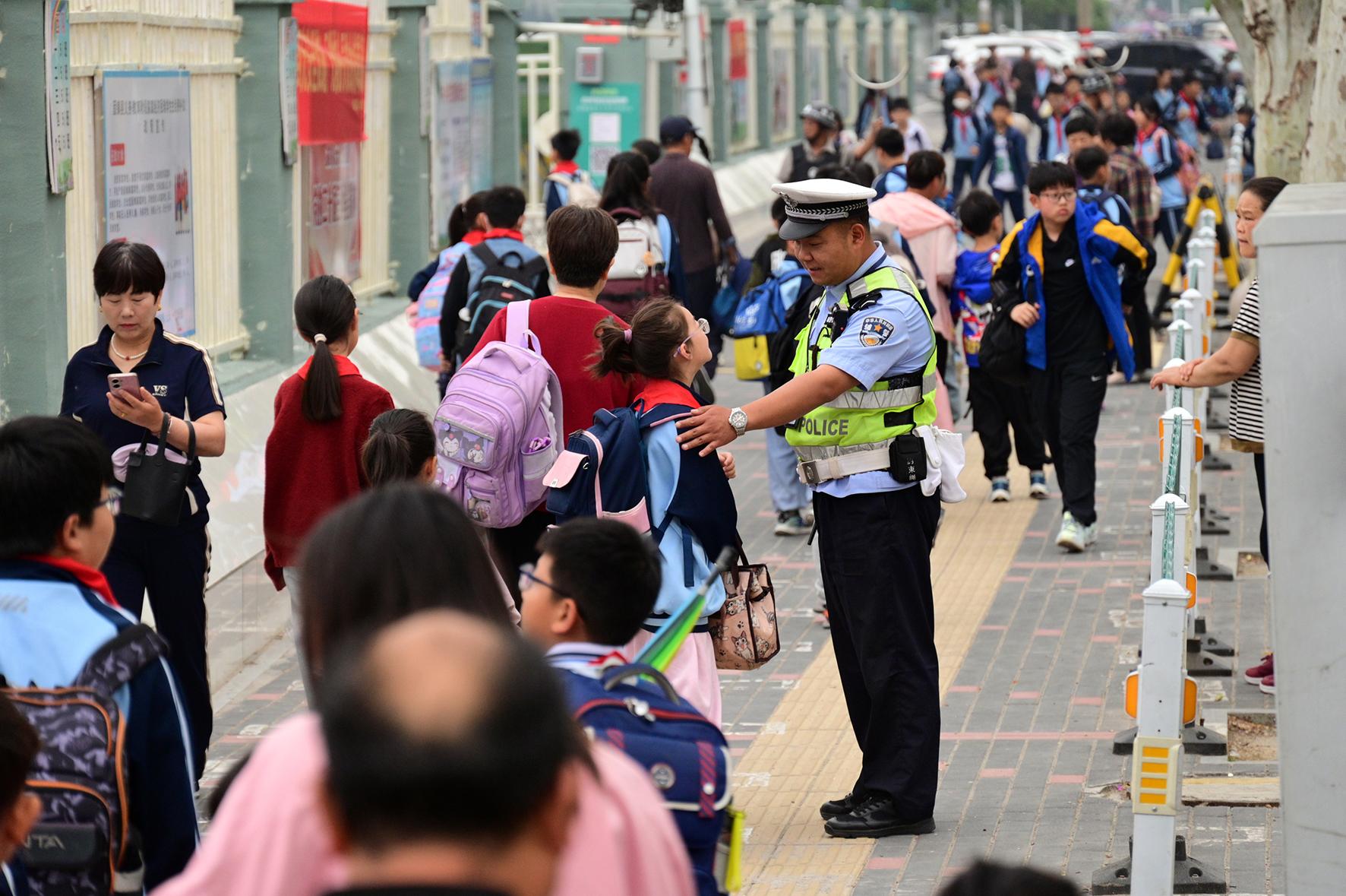 5月14日,安徽省固鎮(zhèn)縣公安局交管大隊(duì)輔警在澮河路第五小學(xué)路段指揮疏導(dǎo)交通,護(hù)送學(xué)生安全入校。