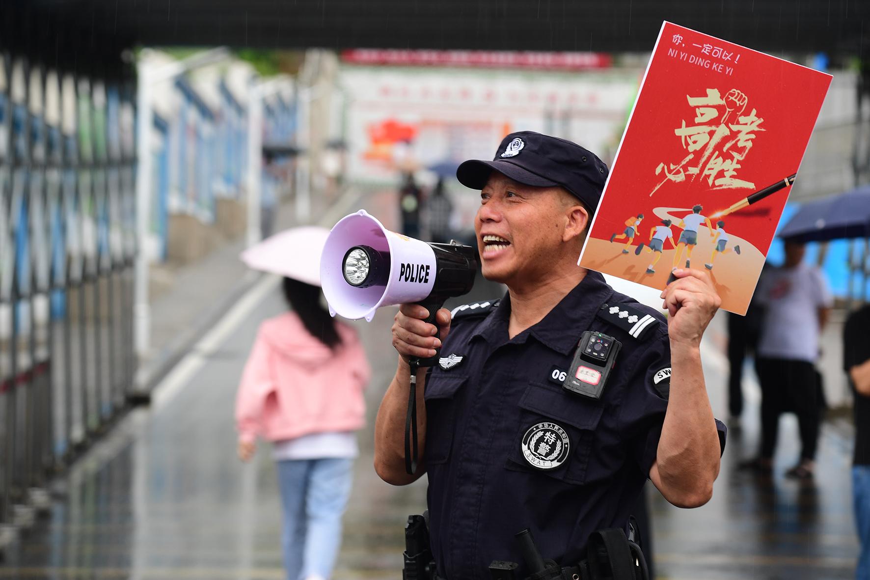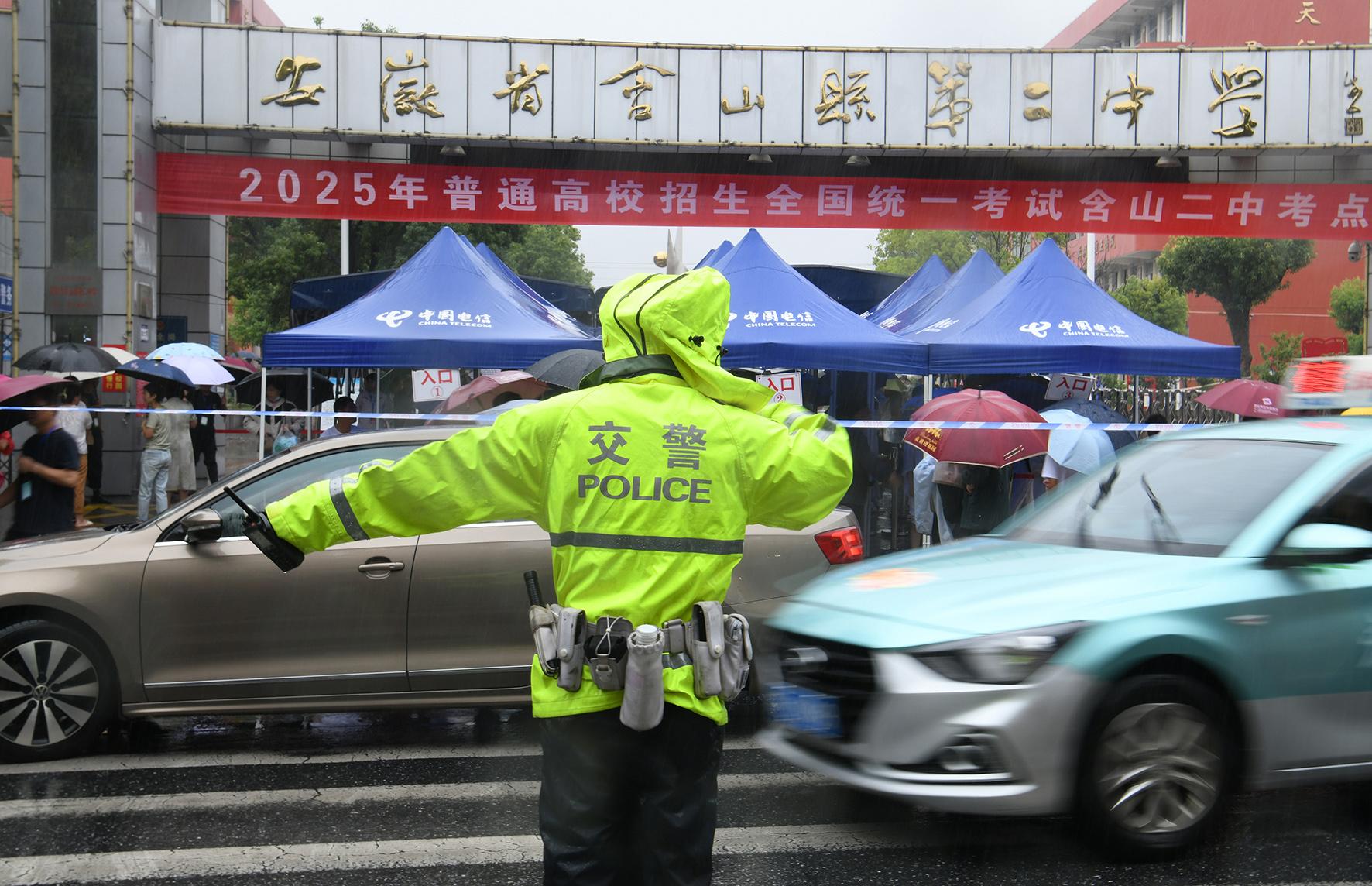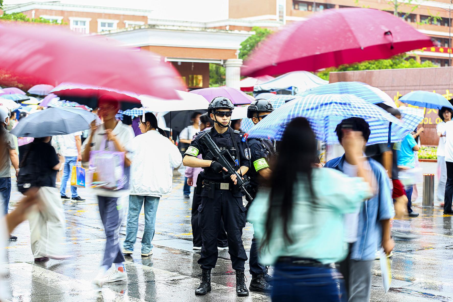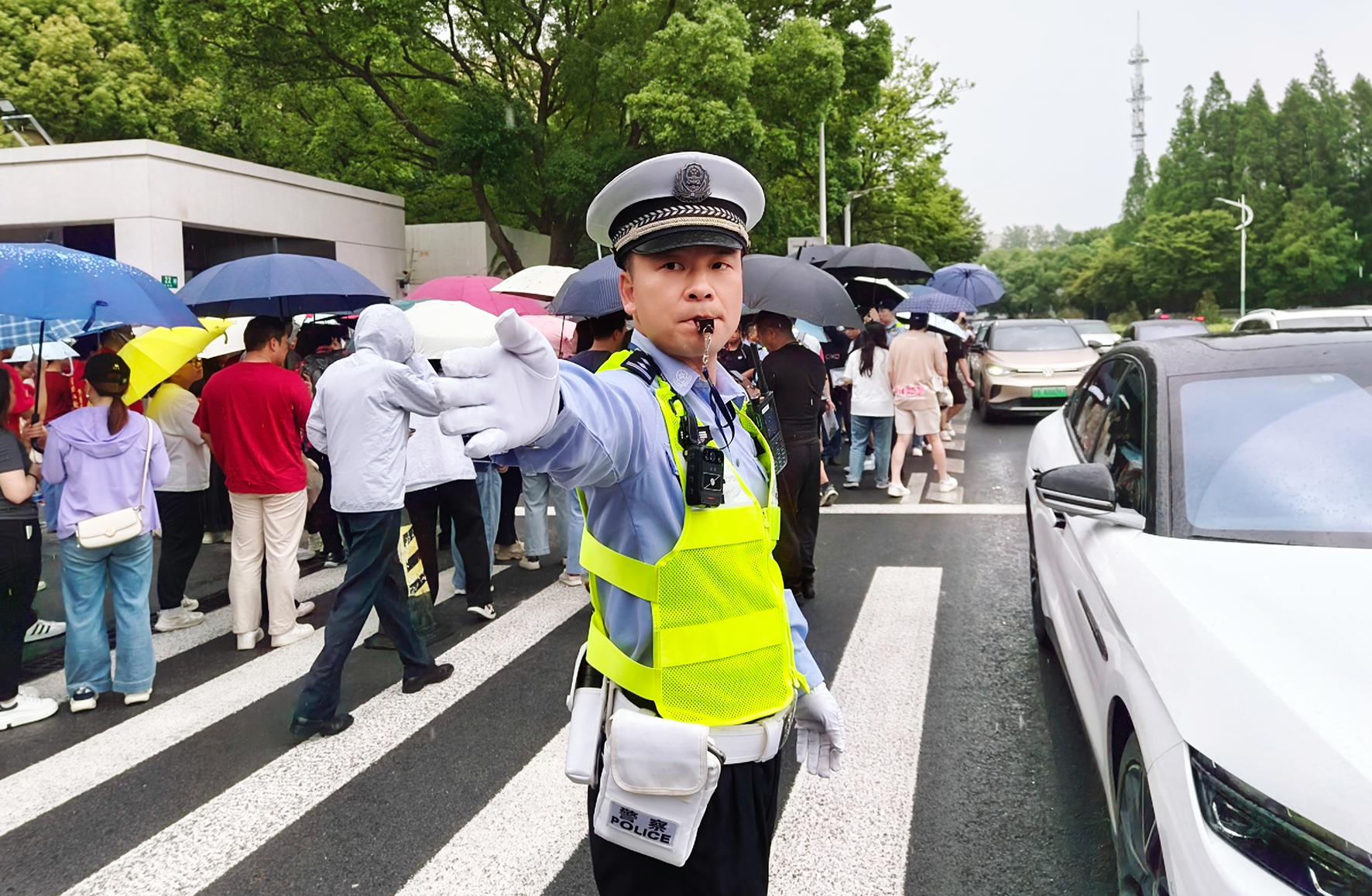 6月7日,江蘇省南通市在雨中迎來高考。南通市公安局民警全警動員,堅守崗位,護(hù)航學(xué)子圓夢。
