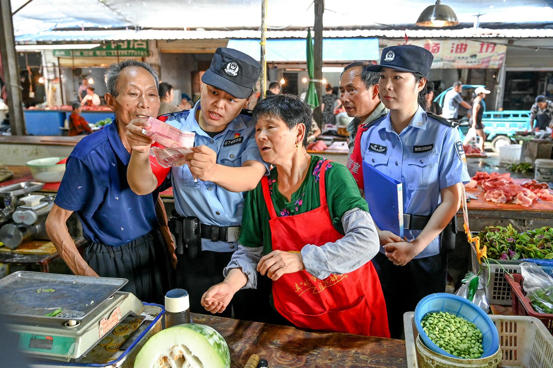 7月4日,安徽省馬鞍山市和縣公安局經(jīng)偵大隊(duì)民警在農(nóng)貿(mào)市場(chǎng)向群眾開展識(shí)別假幣宣傳,通過傳授“一轉(zhuǎn)二摸三透光”小妙招,提升群眾識(shí)假能力,筑牢安全防線。