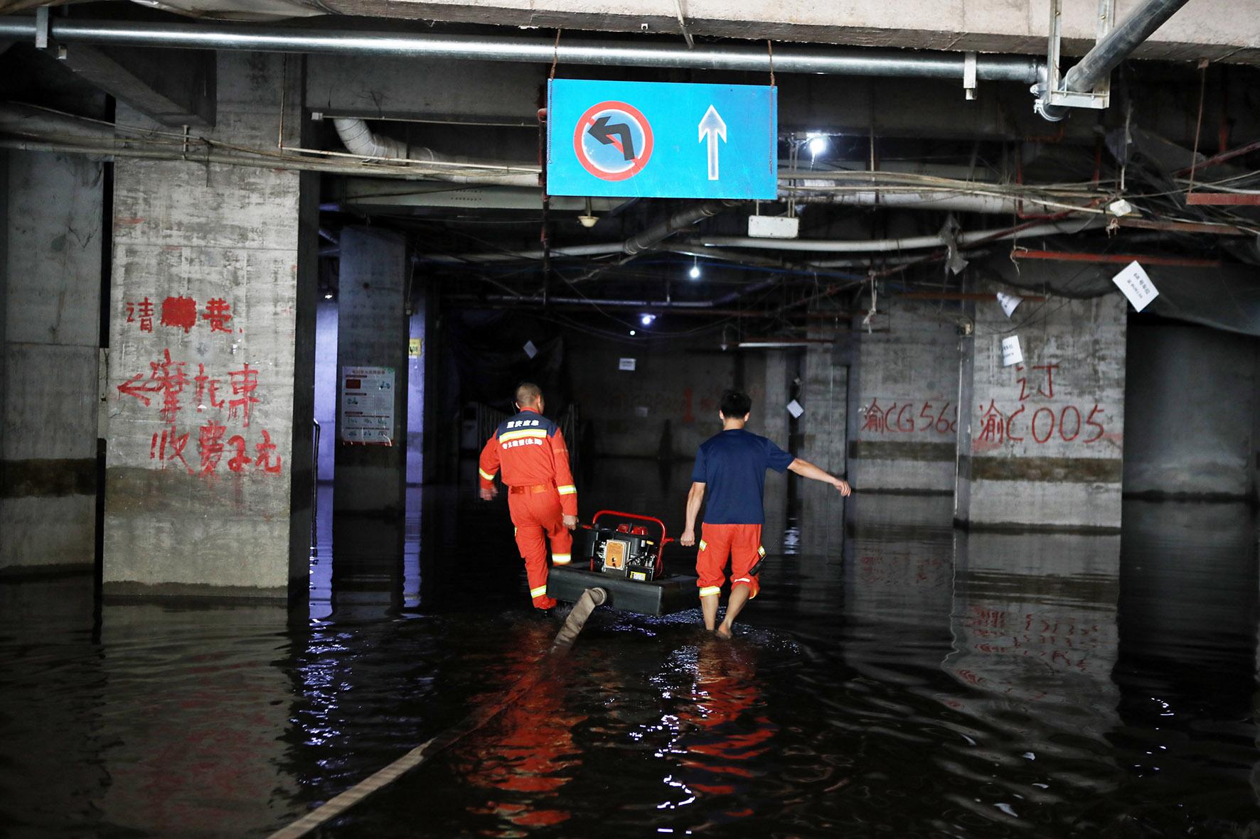 7月9日,重慶市永川區(qū)應(yīng)急救援人員在城區(qū)低洼地段、地下停車庫等受災(zāi)區(qū)域進(jìn)行排水作業(yè)。