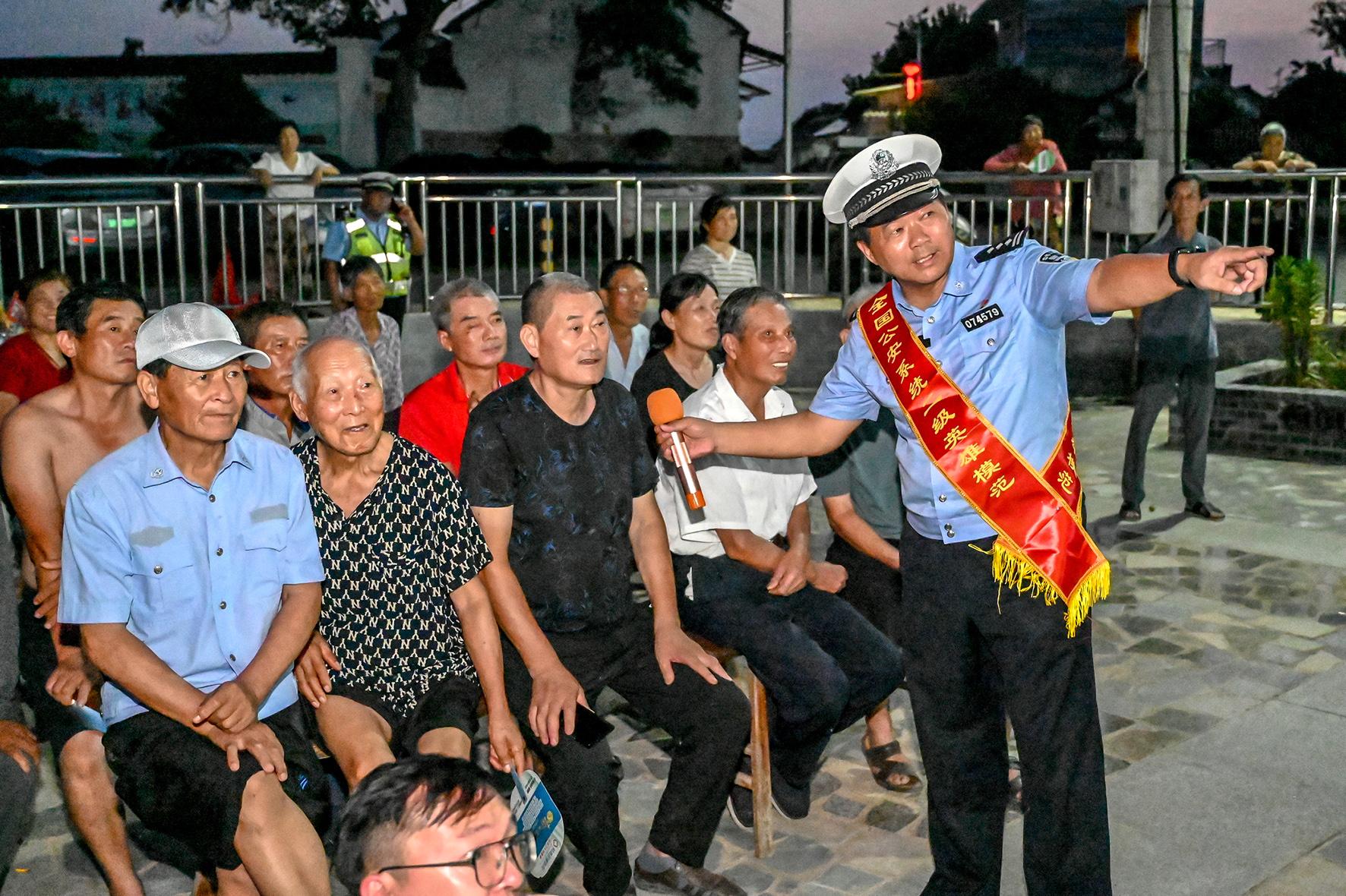 7月20日晚,在安徽省馬鞍山市和縣烏江鎮(zhèn)曹莊村,全國公安系統(tǒng)二級英雄模范、和縣公安局交管大隊民警杜昌來向村民開展交通安全宣講。