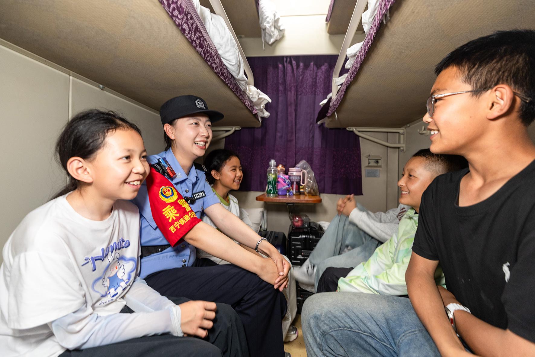 7月25日,青藏鐵路公安局西寧乘警支隊組織民警護送乘坐Z22次列車,來自西藏自治區(qū)的500名學生前往北京天安門看升國旗。