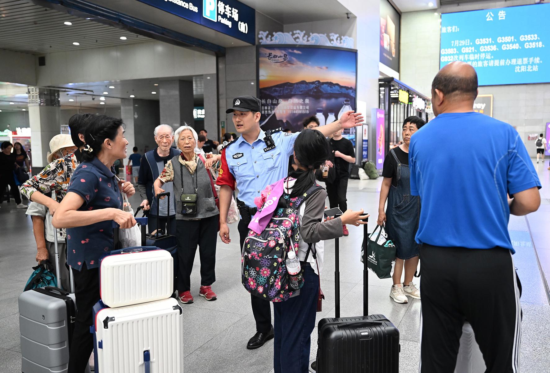 7月29日,沈陽鐵路公安處沈陽北站派出所針對暑運期間學(xué)生流、家庭游旅客流激增的情況,增派警力在候車室開展安全提醒服務(wù)。