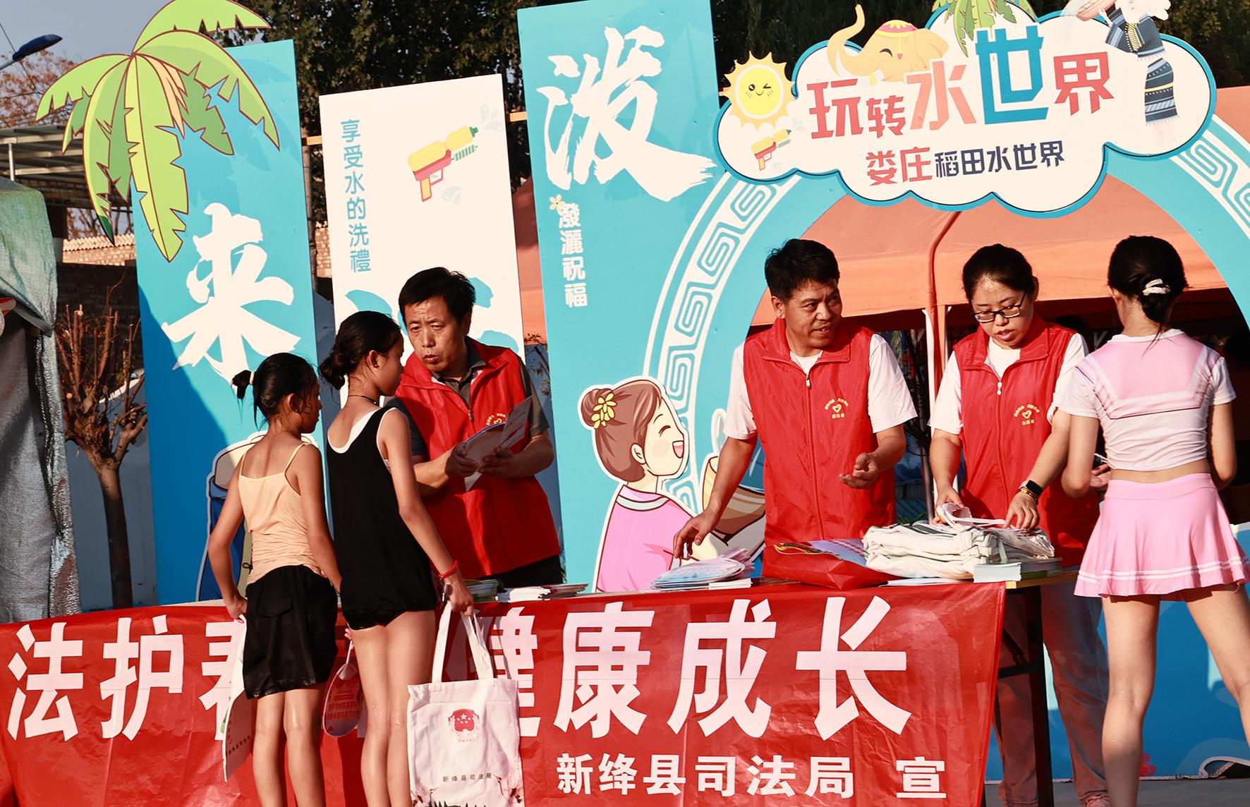 7月28日,山西省運(yùn)城市新絳縣司法局“法護(hù)春苗 健康成長”暑假普法小分隊(duì)在婁莊村稻田小鎮(zhèn)水世界為中小學(xué)生普及未成年人保護(hù)法等法律知識。