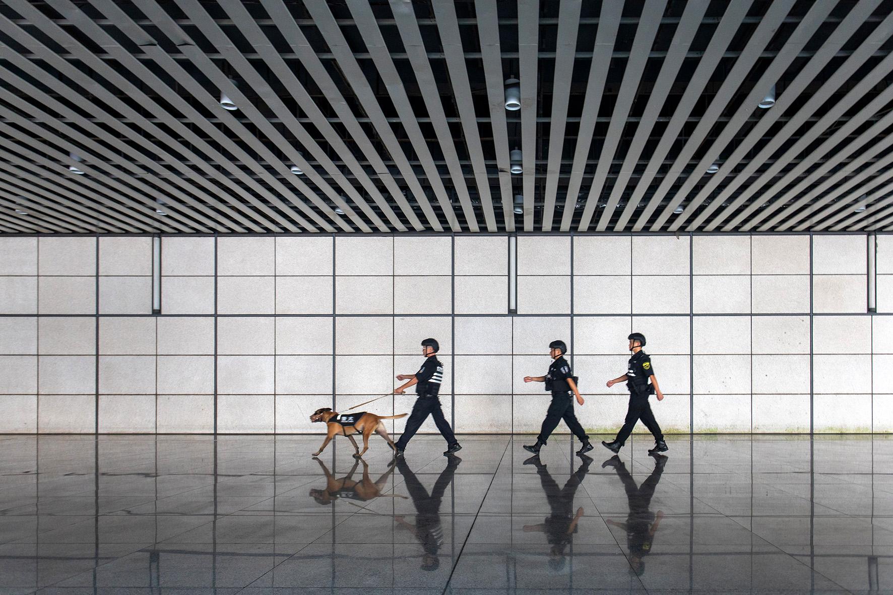 8月4日,浙江省臺州市公安局黃巖分局巡特警大隊民輔警冒著高溫在臺州西站執(zhí)勤巡邏。