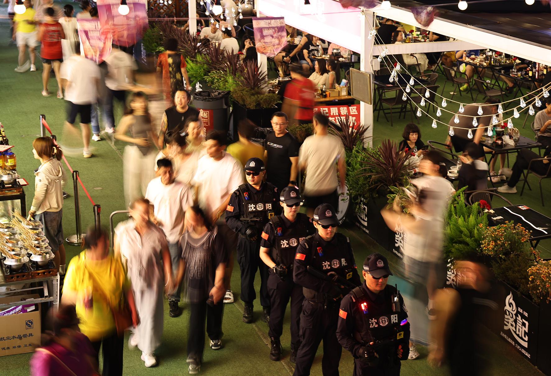 圖為8月18日晚,巡特警大隊(duì)民警在渾河外灘商業(yè)網(wǎng)點(diǎn)巡邏。