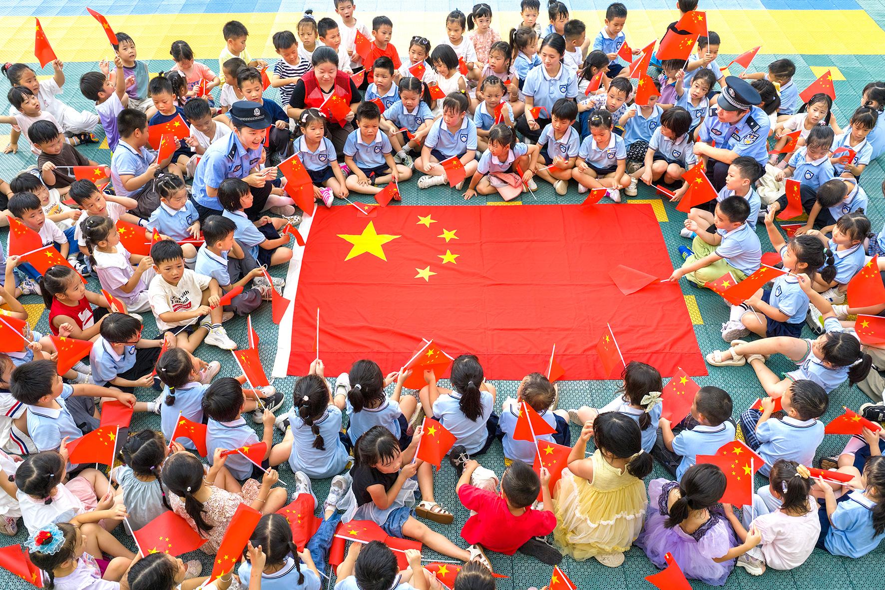9月25日,浙江省臺州市公安局黃巖分局城東派出所民警和東城街道方山社區(qū)志愿者一起走進轄區(qū)幼兒園,給孩子們講解國旗知識。