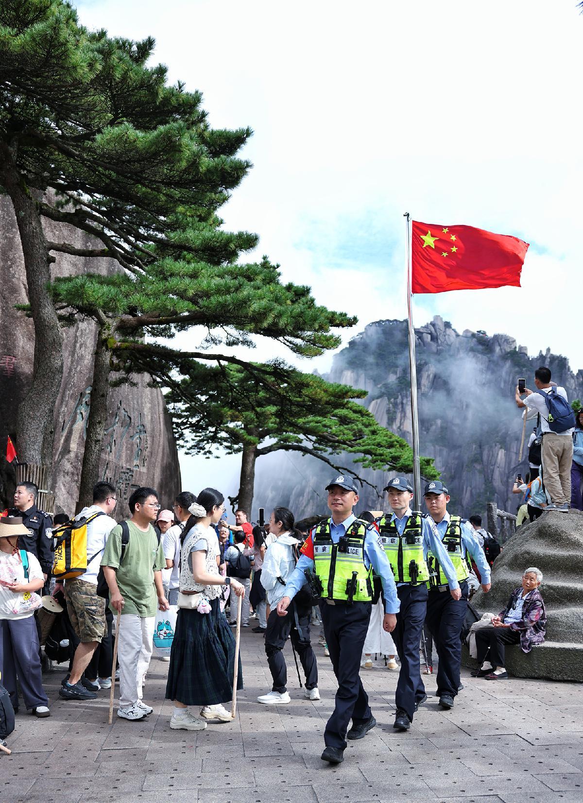 10月1日,安徽省黃山風景區(qū)公安局玉屏樓派出所執(zhí)勤民輔警在迎客松前巡邏。