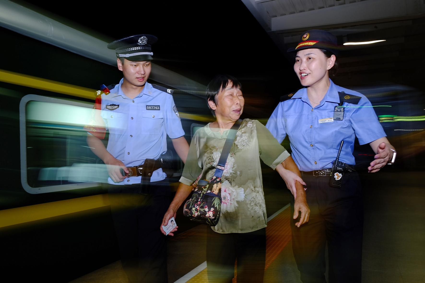 10月15日晚,杭州鐵路公安處金華站派出所民警與車(chē)站員工熱情幫助一位78歲、首次乘火車(chē)出行的大媽上車(chē)。