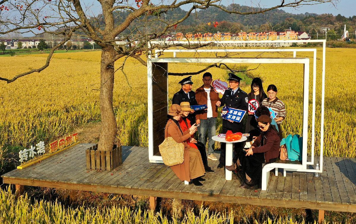 11月13日,安徽省舒城縣公安局網(wǎng)監(jiān)大隊(duì)聯(lián)合闕店派出所走進(jìn)轉(zhuǎn)水灣村“稻田樹(shù)下”打卡點(diǎn),向游客和村民開(kāi)展打擊整治網(wǎng)絡(luò)謠言宣傳。