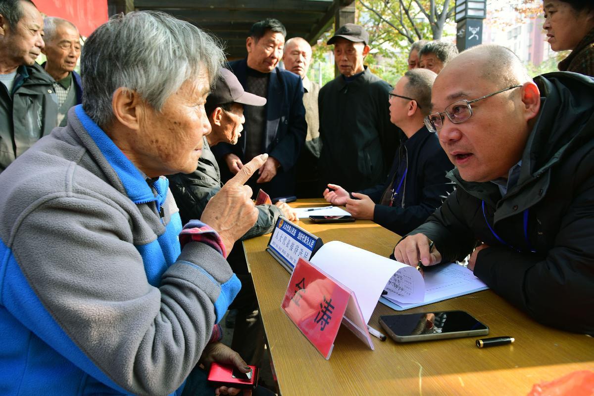 11月14日,在江蘇省鎮(zhèn)江市潤(rùn)州區(qū)和平路街道新金江社區(qū),人大代表面對(duì)面聽(tīng)取選民的意見(jiàn)和建議。當(dāng)日,鎮(zhèn)江市開(kāi)展“五級(jí)人大代表接待選民日”活動(dòng),各級(jí)人大代表分別走進(jìn)村和社區(qū)接待選民,面對(duì)面傾聽(tīng)民聲民意。