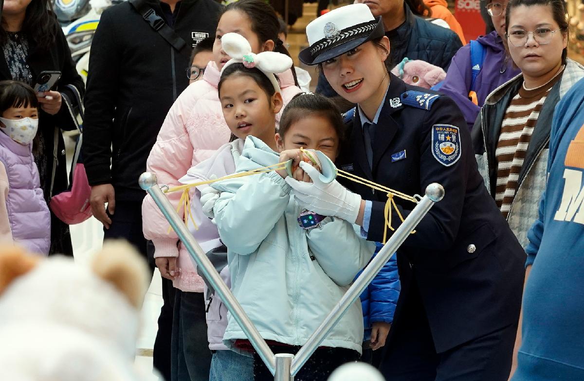 12月1日,在江蘇省興化市施耐庵幼兒園,興化市公安局民警通過趣味游戲的方式為小朋友們講解交通安全知識。