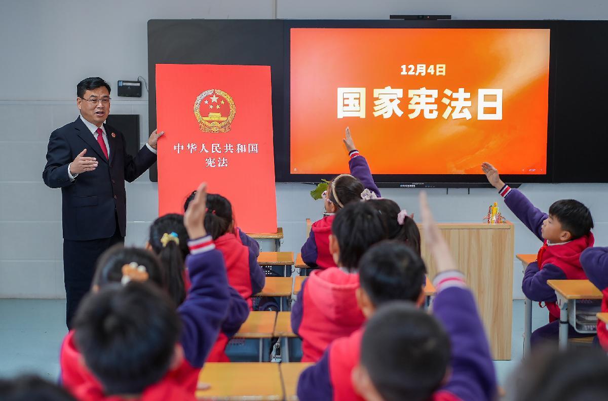 12月3日,在山東省棗莊市市中區(qū)文化路小學(xué),棗莊市市中區(qū)人民法院法官為學(xué)生講解憲法知識。