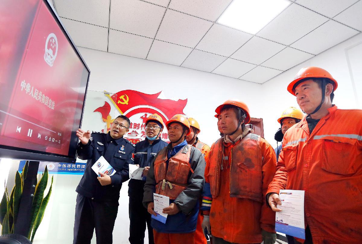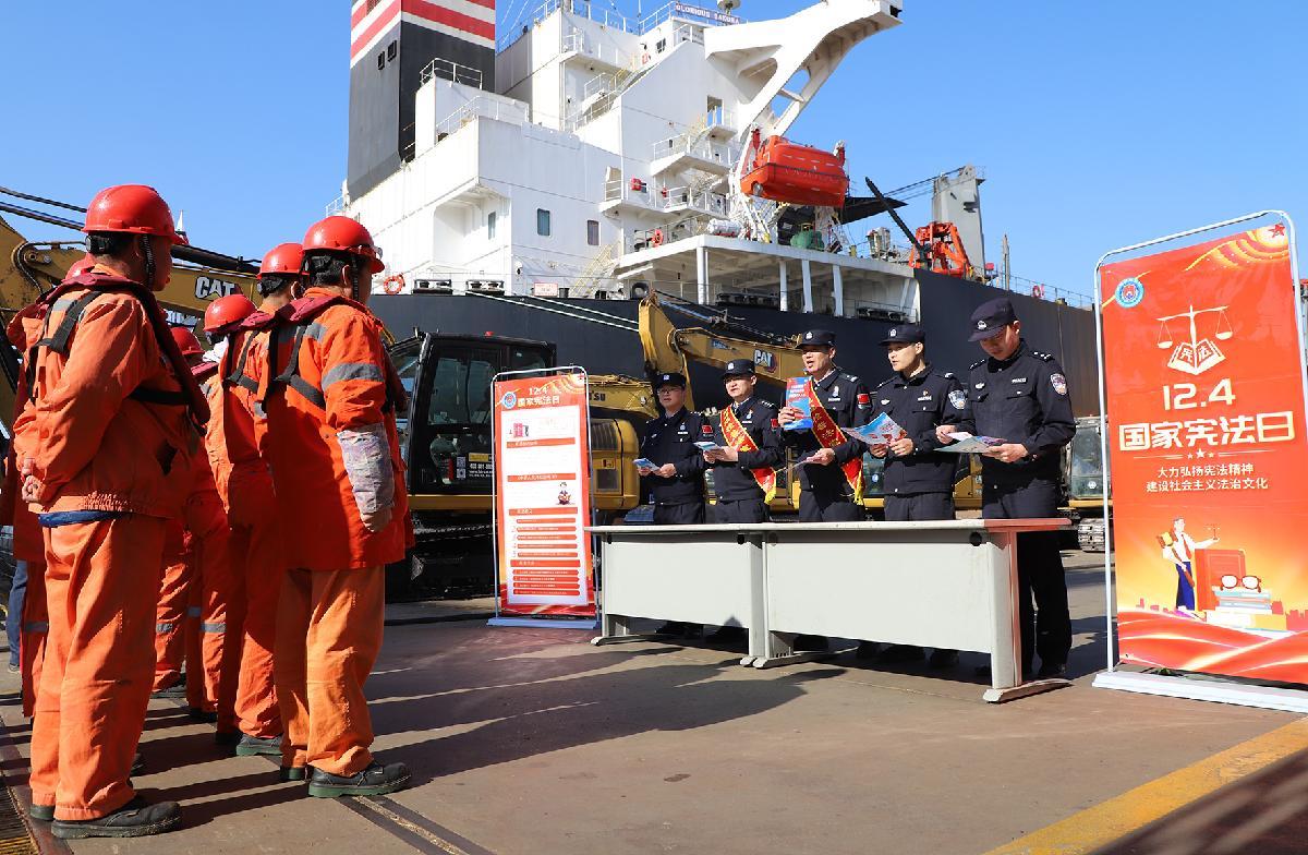 12月3日,在南京港新生圩港區(qū),南京港出入境邊防檢查站執(zhí)勤民警為碼頭工人宣講憲法知識。