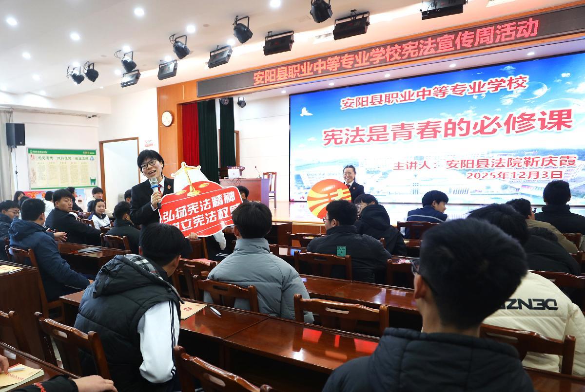 12月3日,河南省安陽縣人民法院組織干警走進(jìn)安陽縣職業(yè)中等專業(yè)學(xué)校,開展“憲法是青春的必修課”主題宣傳。