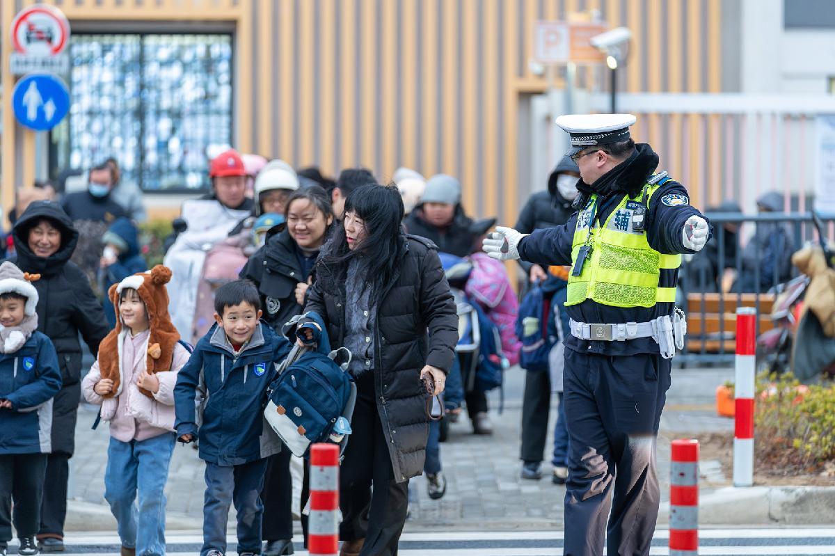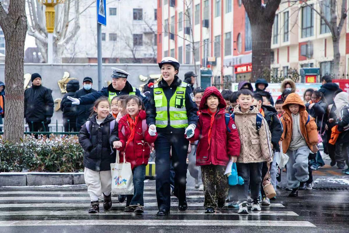 1月19日,山東省煙臺(tái)市公安局芝罘分局民警冒雪在轄區(qū)幼兒園門口執(zhí)勤,護(hù)送孩子們平安放學(xué)。