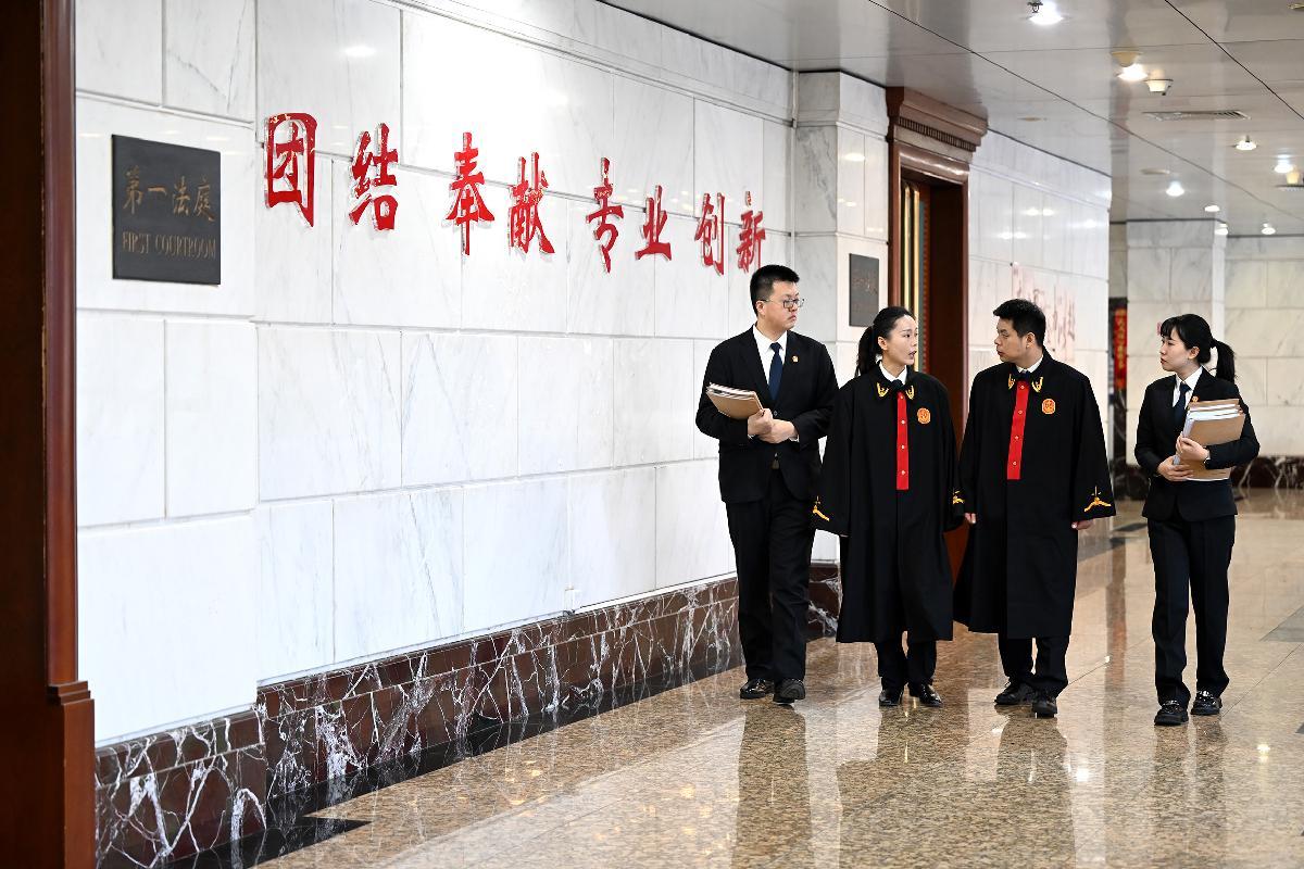 2025年12月31日,北京市朝陽(yáng)區(qū)人民法院民二庭法官王菁璐(左二)與法官周劍彬(右二)在前往法庭的路上,分析案件審理思路。