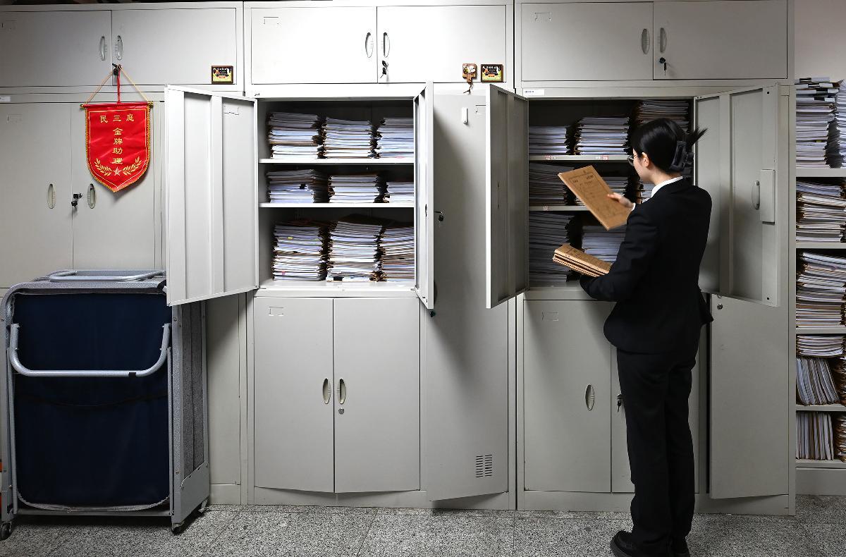 2025年12月31日下午5時(shí),北京市朝陽(yáng)區(qū)人民法院民三庭法官助理熊格將2025年審結(jié)最后一個(gè)案件的卷宗整理好、放入卷柜中。