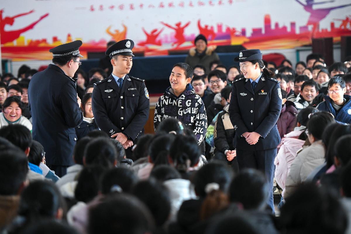 1月26日,在安徽省馬鞍山市和縣善厚中學,當?shù)毓裁窬瘒@“陽光下的守護”這一主題,向學生開展“拒絕校園欺凌”等法治宣傳,通過案例解析、現(xiàn)場互動等方式,提升學生法治意識和自我保護意識。