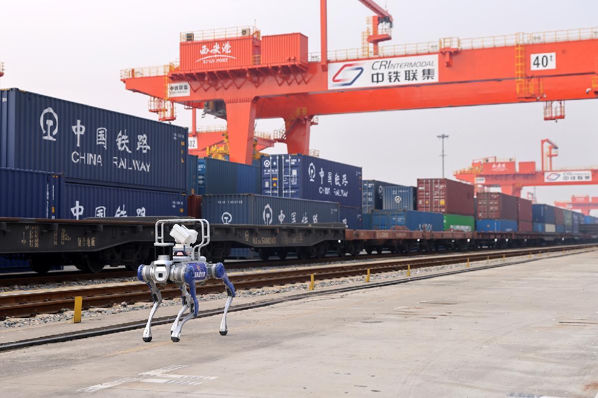 2月4日,在中歐班列(西安)起點(diǎn)西安國(guó)際港站內(nèi),由西安鐵路公安處、西北工業(yè)大學(xué)光電與智能研究院共同研發(fā)的智能巡控機(jī)器狗正在開展巡邏作業(yè)。